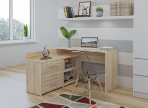 Model ACLE łączy funkcję biurka i komody, dzięki czemu wszystko masz w jednym miejscu. Blat daje przestrzeń na komputer, a boczna część z szufladami i półkami pozwala uporządkować dokumenty i akcesoria. Kolor dąb sonoma wprowadza do wnętrza naturalny efekt i dobrze komponuje się z jasnymi oraz drewnianymi elementami. Dzięki temu biurko narożne dąb sonoma sprawdzi się zarówno w pokoju młodzieżowym, jak i domowym biurze.