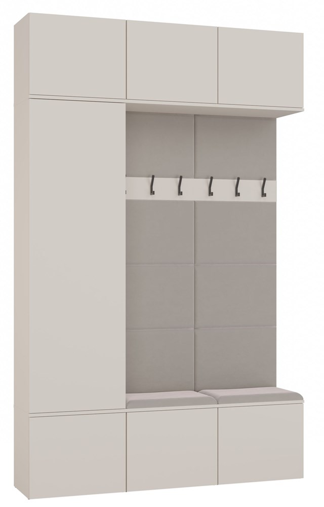 Dolna część mebla to tapicerowane siedzisko z szafką, które zapewnia komfort podczas zakładania butów oraz oferuje praktyczne miejsce do przechowywania drobiazgów. Miękka tkanina w kolorze beżowym nadaje wnętrzu przytulności, a system otwierania TIP-ON pozwala zachować minimalistyczny wygląd frontów. To nowoczesna garderoba z siedziskiem, która łączy design z codzienną wygodą użytkowania.