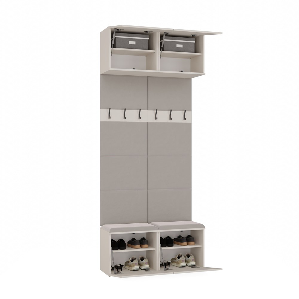 Dolną część mebla tworzą dwie szafki z tapicerowanymi siedziskami, które stanowią wygodne miejsce do zakładania obuwia. Wewnątrz każdej szafki znajduje się przestrzeń do przechowywania butów, toreb lub drobiazgów. Fronty otwierane systemem TIP-ON podkreślają minimalistyczny wygląd garderoby i zapewniają wygodne użytkowanie. Garderoba do przedpokoju z siedziskiem to funkcjonalne i eleganckie rozwiązanie, które dodaje wnętrzu harmonii.