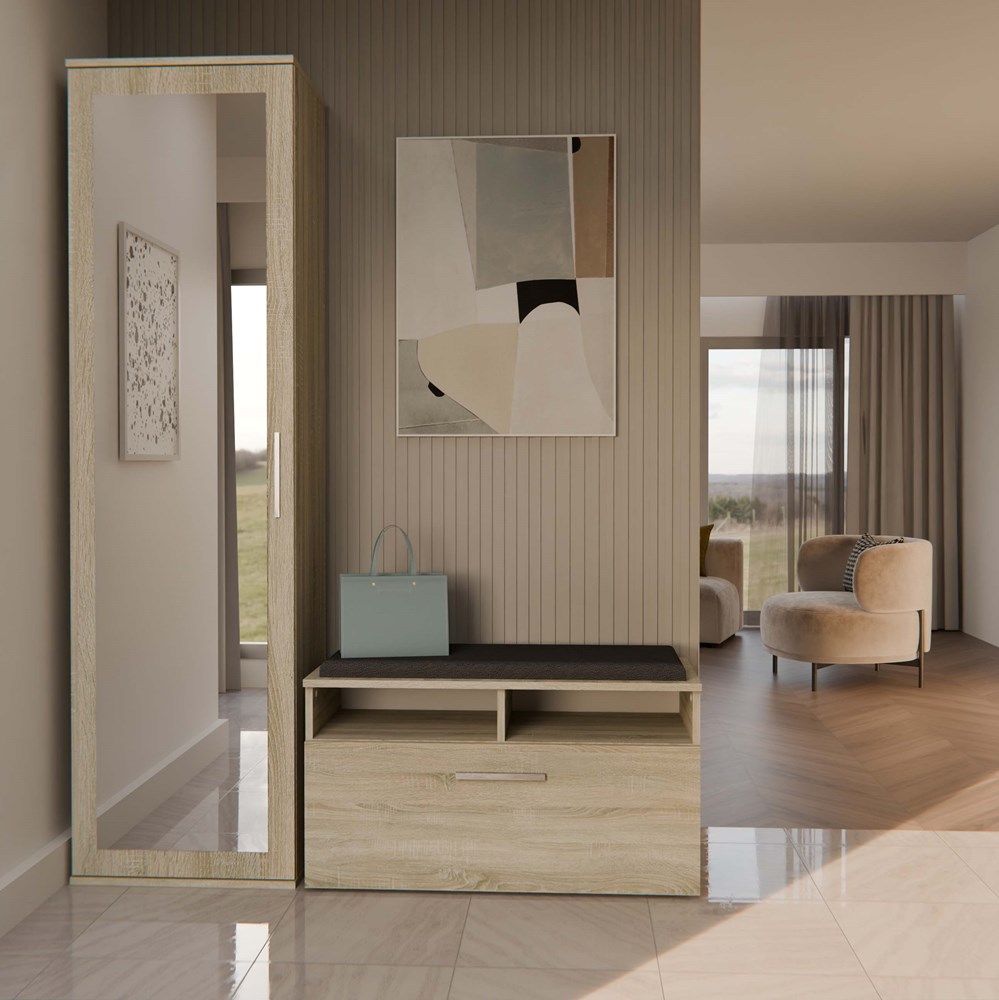 Garderoba do przedpokoju dąb sonoma DUET 50cm - praktyczny mebel do przedpokoju, który pozwoli na stworzenie funkcjonalnego i modnego pomieszczenia. Wąska szafa z lustrem do przedpokoju dąb sonoma DUET to niebanalny element harmonijnie dopełniający nowoczesny i klasyczny design mieszkania. Wykonany z najwyższej jakości materiałów charakteryzuje się dużą odpornością na uszkodzenia mechaniczne. Konkurencyjna cena oraz solidna konstrukcja sprawia, że jest doskonałym wyborem do Twojego przedpokoju.