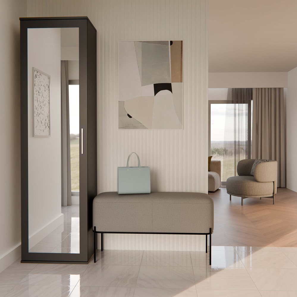 Garderoba przedpokój czarna DUET 50cm to połączenie uniwersalnych walorów z ponadczasowym wzornictwem. Mebel wykonany z dbałością o każdy detal zachwyci zarówno oryginalnym wyglądem, jak i użytecznością. Garderoby z lustrem czarne DUET mamy możliwość uzyskania sporej przestrzeni do przechowywania, która pozwoli utrzymać ład i porządek w pomieszczeniu.