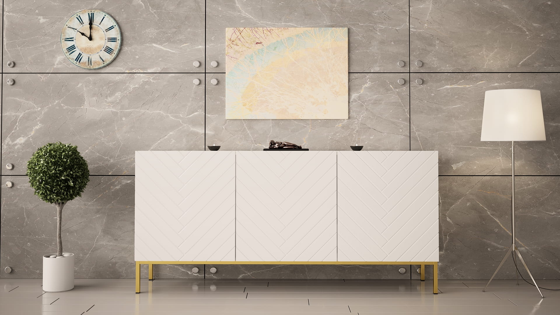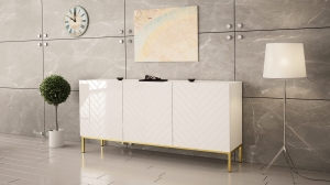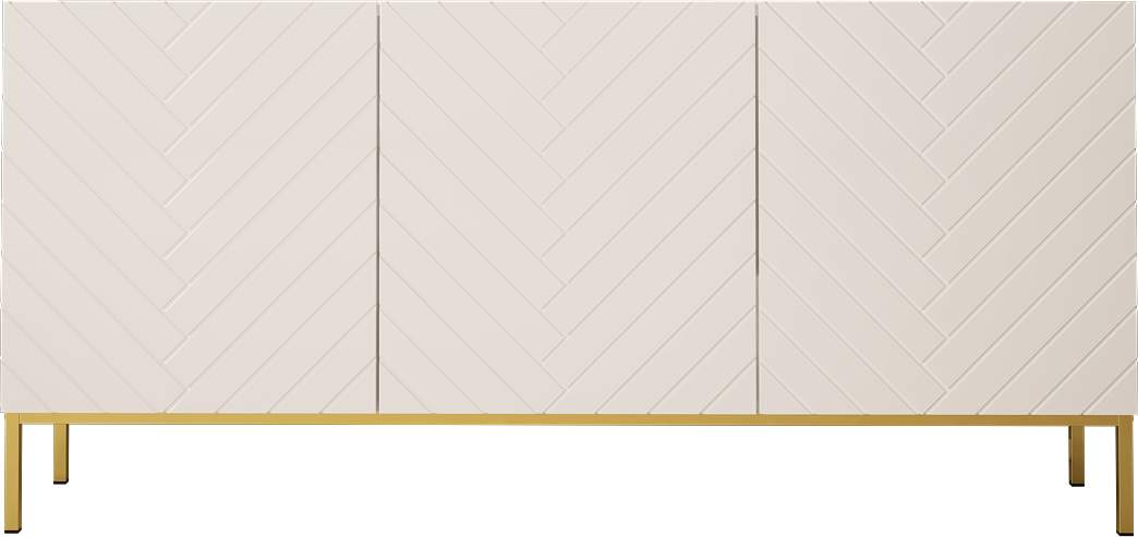 Frezowane fronty w jodełkę tworzą efektowną strukturę, która nadaje meblowi wyjątkowego charakteru. Połysk podkreśla elegancję i sprawia, że komoda prezentuje się bardzo nowocześnie. Złoty stelaż wprowadza subtelny akcent glamour i dodaje wizualnej lekkości. To stylowa komoda do salonu, która wyróżnia się na tle innych mebli.