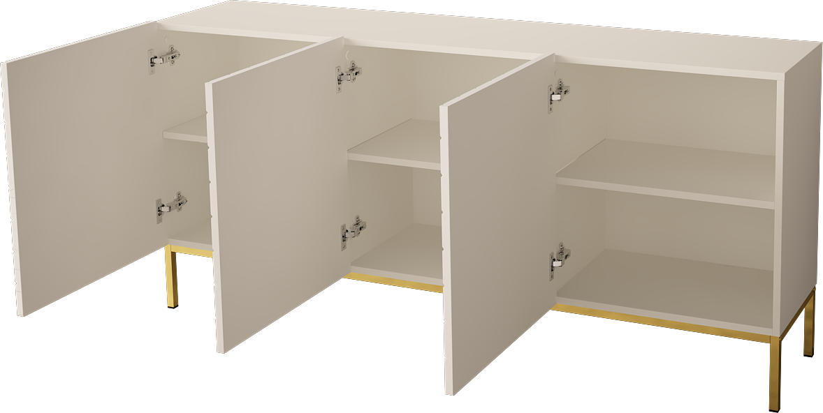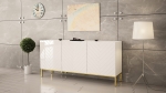 Korpus z płyty laminowanej oraz fronty MDF w połysku zapewniają trwałość i estetyczny wygląd przez długi czas. Metalowy stelaż gwarantuje stabilność oraz podkreśla nowoczesny styl mebla. Starannie wykonane frezowania nadają komodzie wyjątkowej głębi. Biała komoda na złotych nogach to połączenie designu i funkcjonalności.
