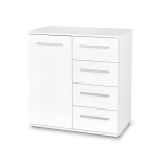 Mebel wykonano z płyty laminowanej, co zapewnia odporność na codzienne użytkowanie oraz łatwość czyszczenia. Fronty w połysku nadają elegancki wygląd, a obrzeża PCV zabezpieczają krawędzie przed uszkodzeniami. Stabilna konstrukcja sprawia, że to trwała komoda biała, która sprawdzi się przez długi czas.