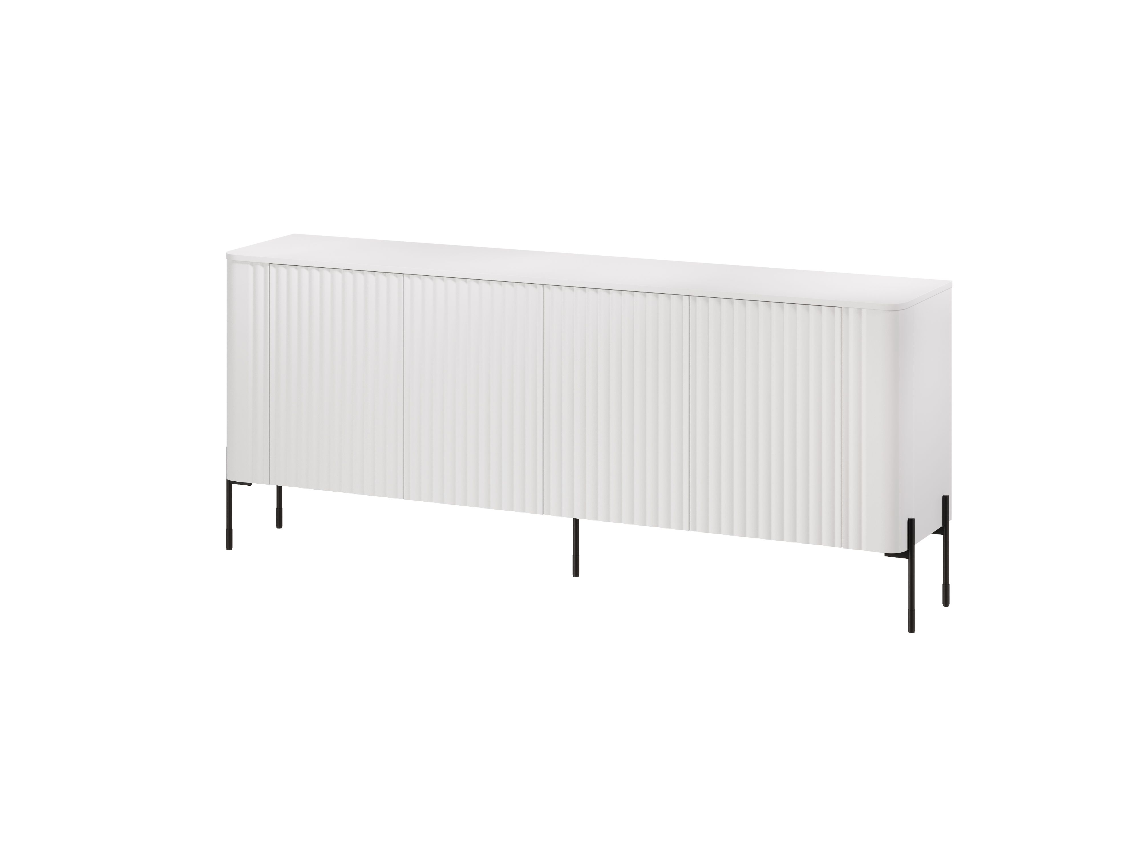 Frezowane fronty wprowadzają subtelną strukturę i wizualną głębię, która pięknie pracuje ze światłem. Bezuchwytowa forma z systemem push to open podkreśla minimalistyczny charakter projektu, a czarne metalowe nóżki nadają całości lekkości. Model doskonale wpisuje się w estetykę, jaką reprezentuje komoda biała mat.