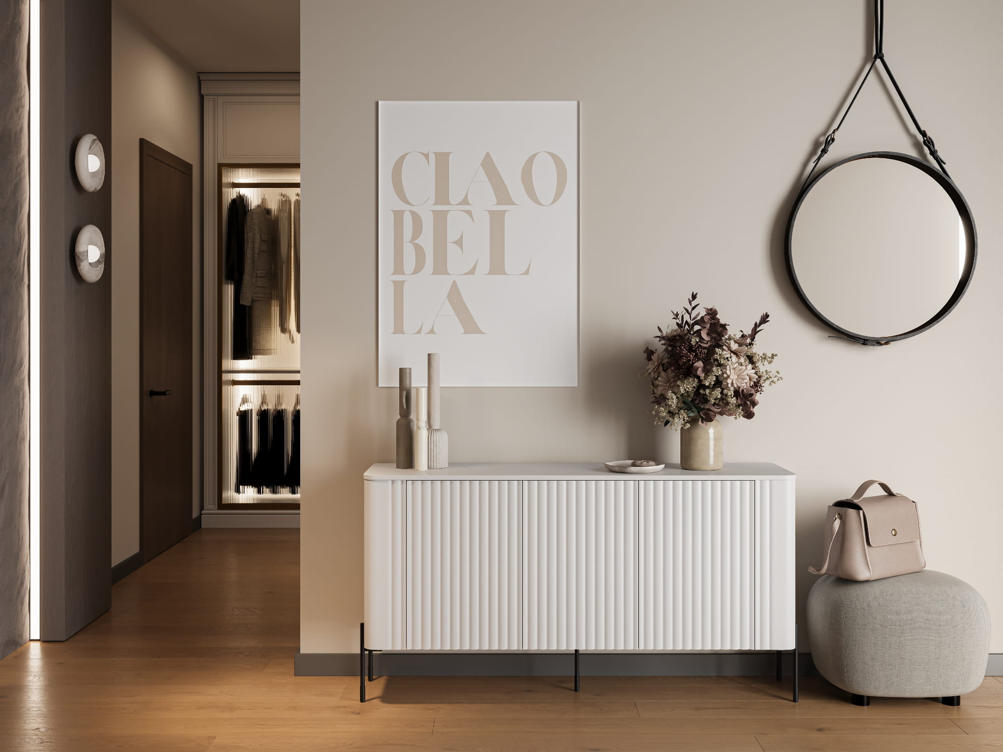 Proporcjonalna bryła i frezowane fronty tworzą spójną, estetyczną całość, która doskonale wpisuje się w nowoczesne przestrzenie dzienne. System push to open podkreśla minimalistyczny charakter mebla, a czarne metalowe nóżki wprowadzają subtelny kontrast. Model doskonale reprezentuje współczesną komodę do salonu.