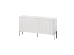 Korpus wykonano z laminowanej płyty wiórowej, natomiast fronty z trwałej płyty MDF z wyraźnymi frezami. Matowe powierzchnie podkreślają spokojny, elegancki charakter mebla, a solidne metalowe nóżki zapewniają stabilność. Całość tworzy dopracowaną wizualnie komodę białą do salonu.
