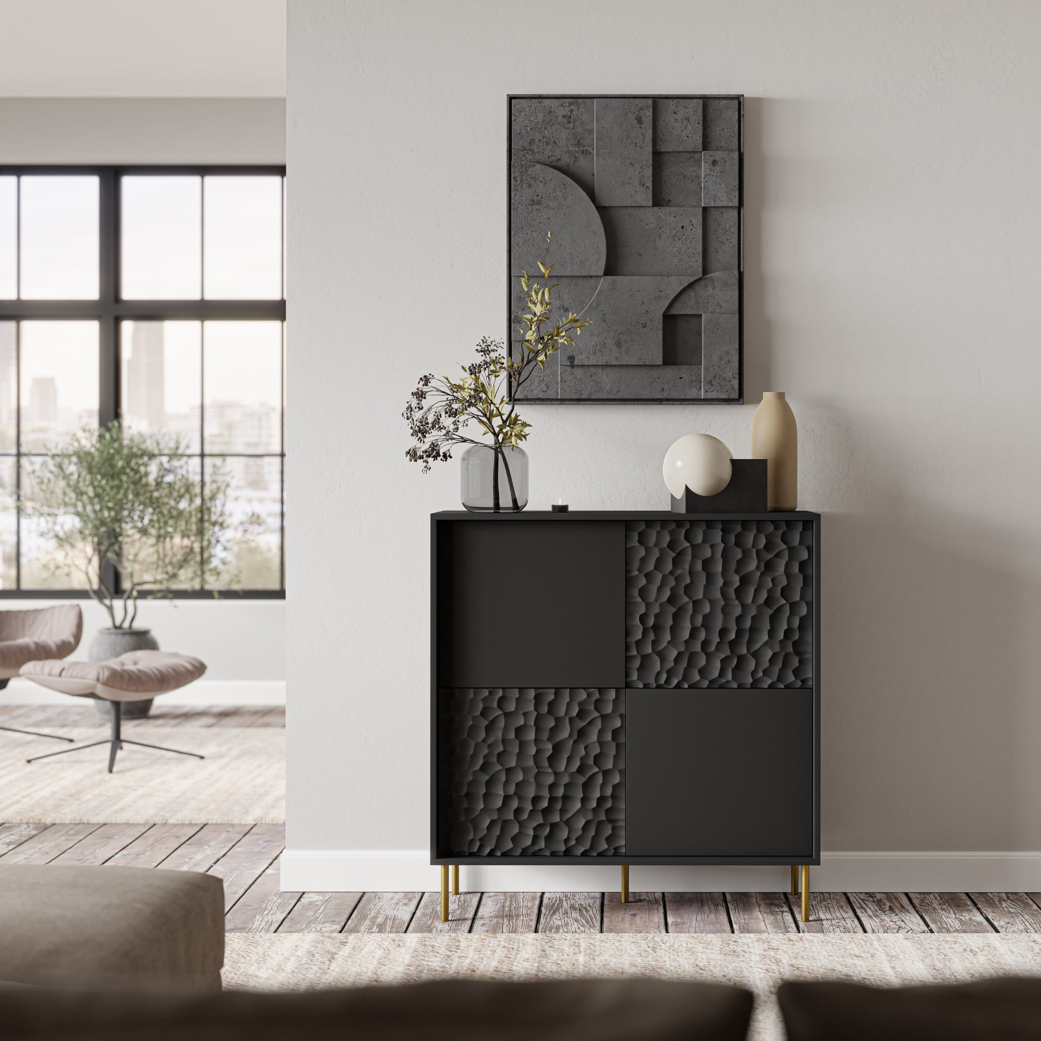Komoda czarna BULLET 100 cm to kompaktowa i stylowa komoda czarna, która świetnie sprawdzi się w salonie, sypialni lub przedpokoju. Wysoka forma pozwala lepiej wykorzystać przestrzeń, a cztery fronty ułatwiają organizację przechowywania. Złote nogi dodają elegancji i sprawiają, że mebel przyciąga uwagę od pierwszego spojrzenia.