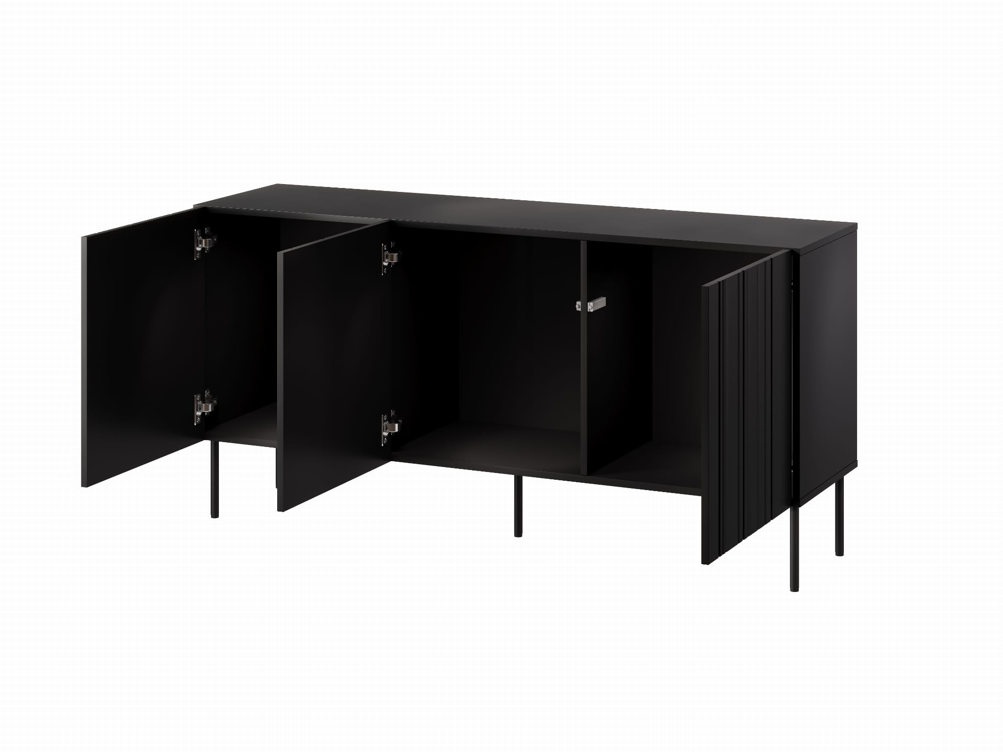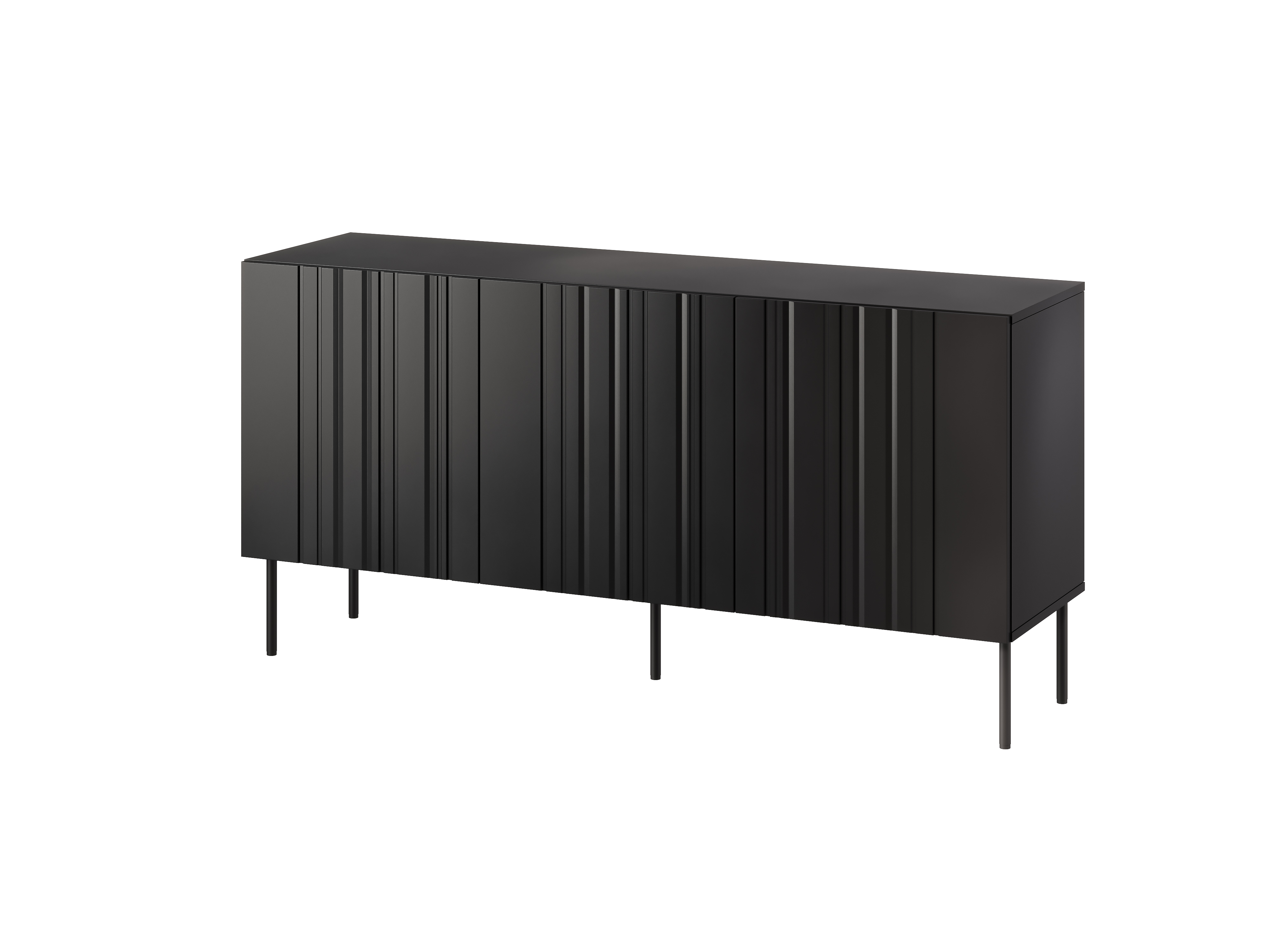 Korpus wykonano z płyty laminowanej 16 mm w czarnym macie, co zapewnia trwałość i odporność na codzienne użytkowanie. Fronty z płyty MDF 16 mm z widocznymi frezami podkreślają dekoracyjny charakter mebla i wysoką jakość wykonania. Stabilne metalowe nóżki unoszą bryłę, a proporcje sprawiają, że komoda 150cm prezentuje się lekko i harmonijnie w przestrzeni.