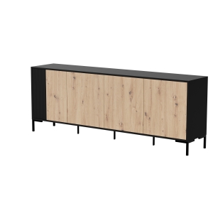 Komoda Czarna MERCI 4D to elegancki mebel, który łączy nowoczesną formę z naturalnym akcentem drewna. Szeroka bryła osadzona na metalowych nóżkach prezentuje się lekko i harmonijnie w przestrzeni. To ponadczasowa czarna komoda, zaprojektowana do stylowych wnętrz.