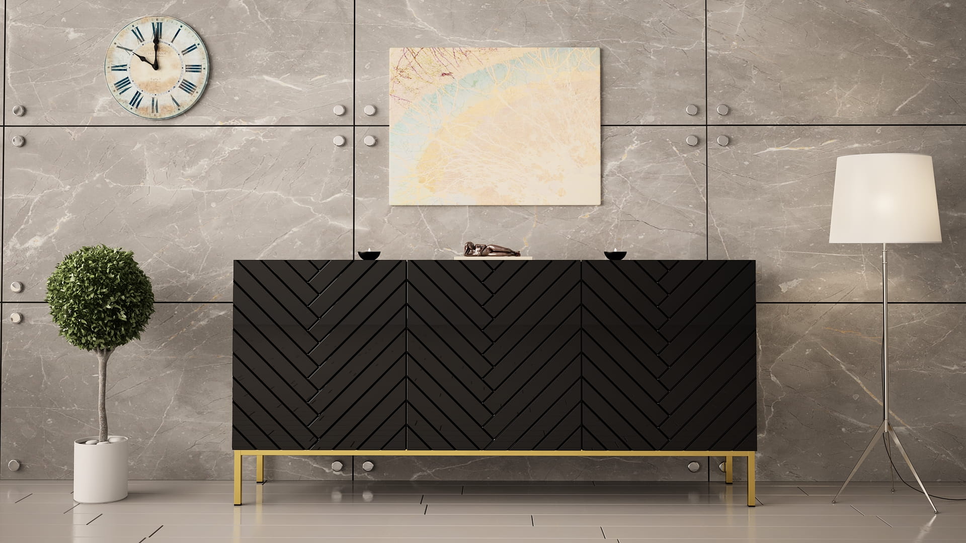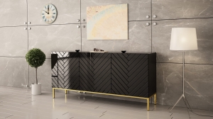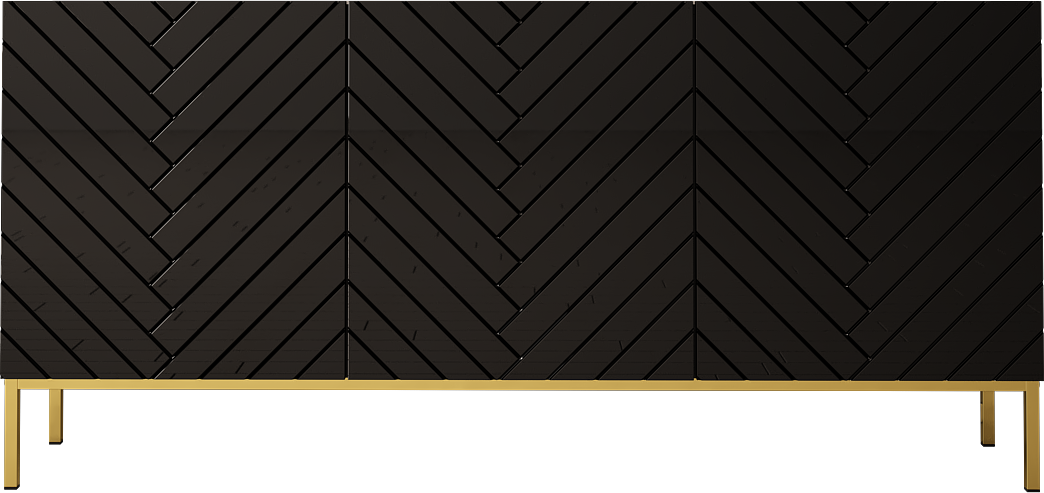 Fronty w wysokim połysku zestawione z frezowaniem w jodełkę tworzą wyjątkowy efekt wizualny. Złoty stelaż nadaje całości lekkości i wprowadza subtelny akcent glamour. Matowy korpus równoważy połysk, dzięki czemu komoda prezentuje się nowocześnie i elegancko. To stylowa komoda do salonu, która przyciąga spojrzenia.