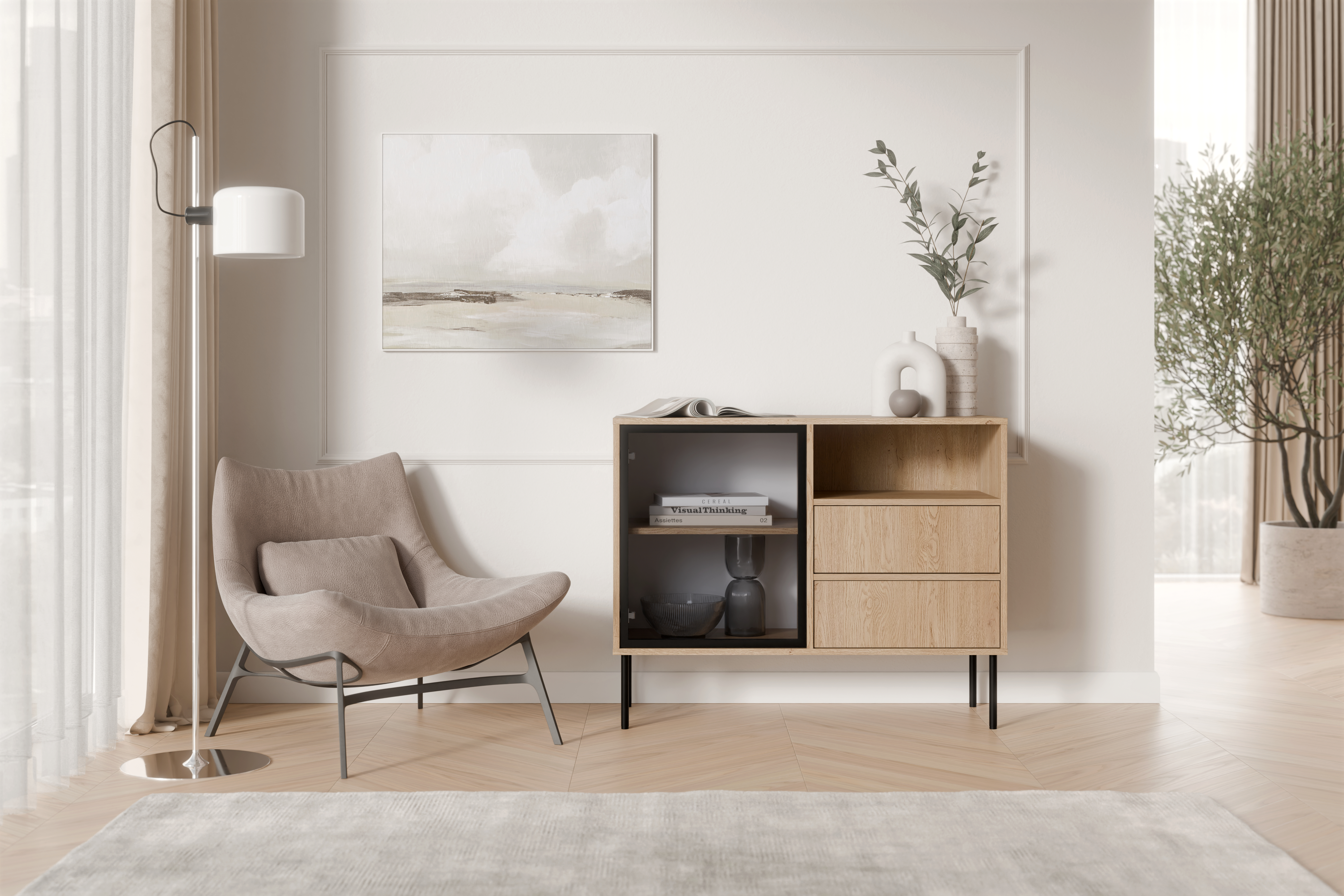 Komoda Dąb Cremona – DOMI 1D2S subtelnie dopełni wnętrze i wprowadzi do niego naturalne ciepło z nutą loftowej elegancji — pozwól jej znaleźć swoje miejsce w Twojej aranżacji.