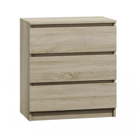 Model dobrze sprawdza się jako komoda sonoma do salonu, ale równie dobrze odnajduje się w sypialni, przedpokoju lub pokoju młodzieżowym. Trzy szuflady pozwalają przechowywać ubrania, dokumenty i drobiazgi w uporządkowany sposób. To praktyczna komodą, która ułatwia organizację przestrzeni bez zajmowania dużej ilości miejsca.