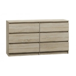 Komoda Dąb Sonoma APLI 6 138 cm to funkcjonalna komoda dąb sonoma, która pomaga utrzymać porządek i wprowadza do wnętrza naturalny, ciepły wygląd. Jasny dekor drewna sprawia, że mebel dobrze komponuje się z różnymi aranżacjami. Sześć szuflad zapewnia wygodne przechowywanie i ułatwia codzienne użytkowanie.