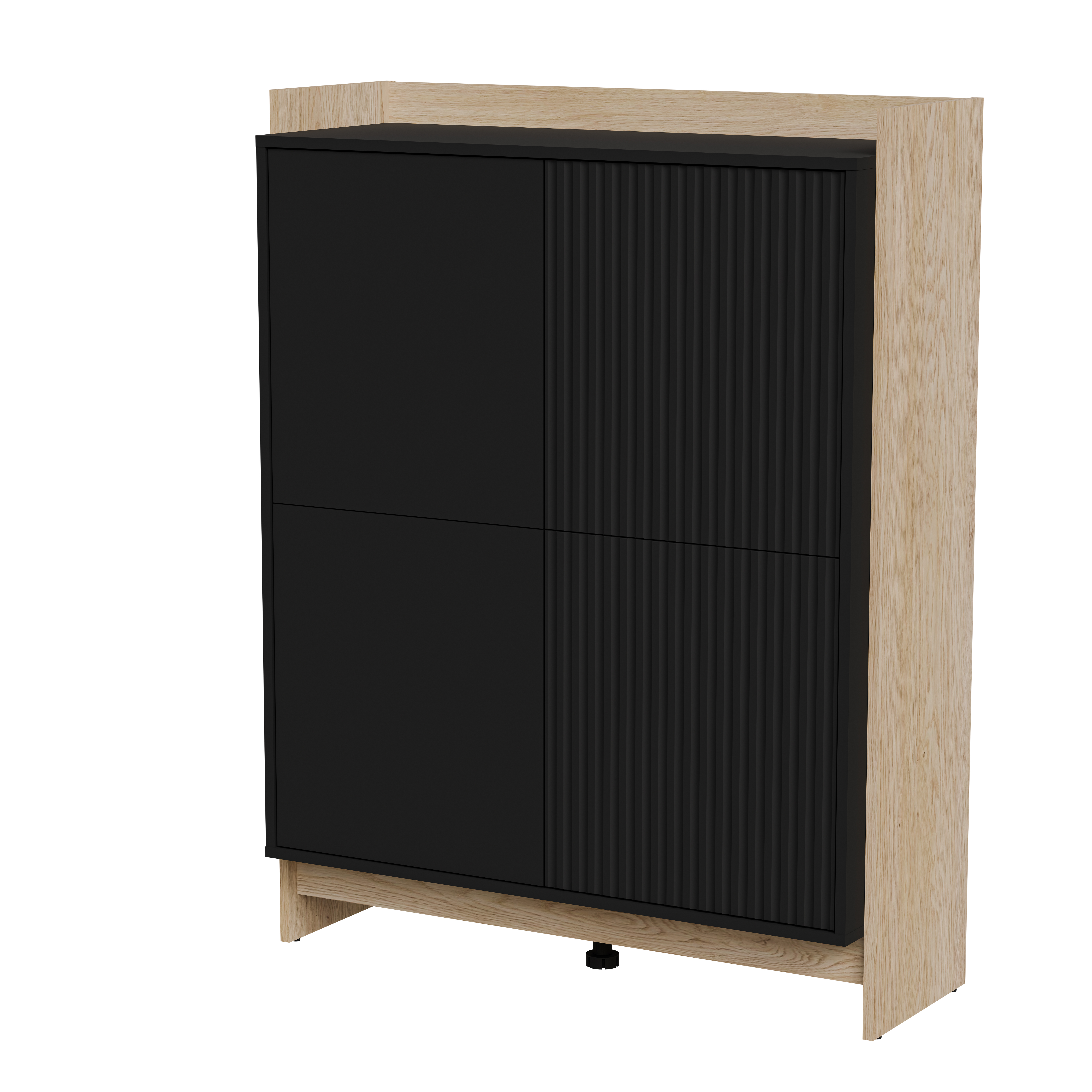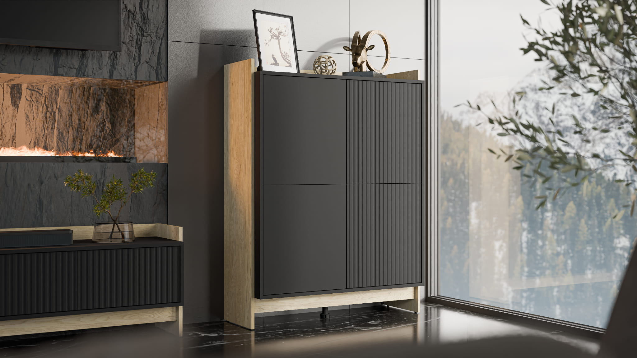 Komoda Dębowa – PORTO 4D to elegancki mebel o wyrazistym charakterze, który łączy ciepły dekor drewna z głębią czerni. Smukła, pionowa bryła oraz cztery zamykane fronty sprawiają, że doskonale sprawdza się jako komoda dębowa do nowoczesnych wnętrz.