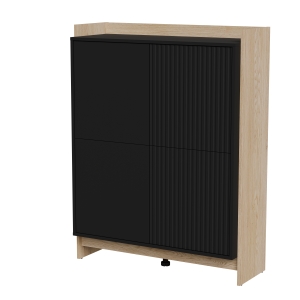 Czarne fronty o dekoracyjnej strukturze przyciągają wzrok i nadają bryle głębi, jednocześnie nie przytłaczając aranżacji. Smukła forma oraz pionowy układ sprawiają, że mebel doskonale odnajduje się jako komoda do sypialni, wprowadzając do niej spokój i harmonię.