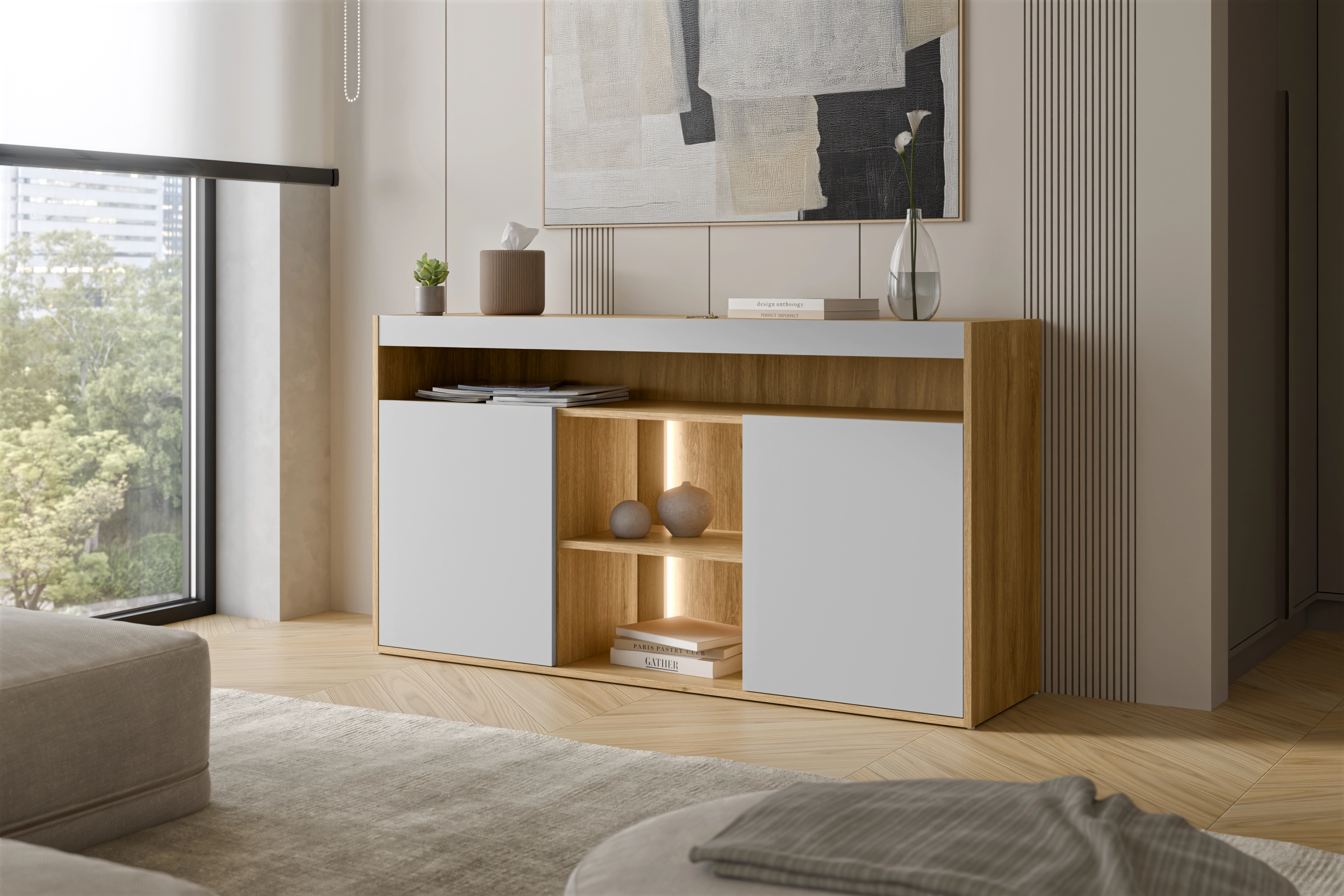 Nie jest za mała, ale też nie zajmuje całej ściany. Komoda 150 cm dobrze pasuje do salonu, sypialni albo pokoju dziennego. Można ustawić ją pod ścianą, obok telewizora albo jako osobny mebel do przechowywania.