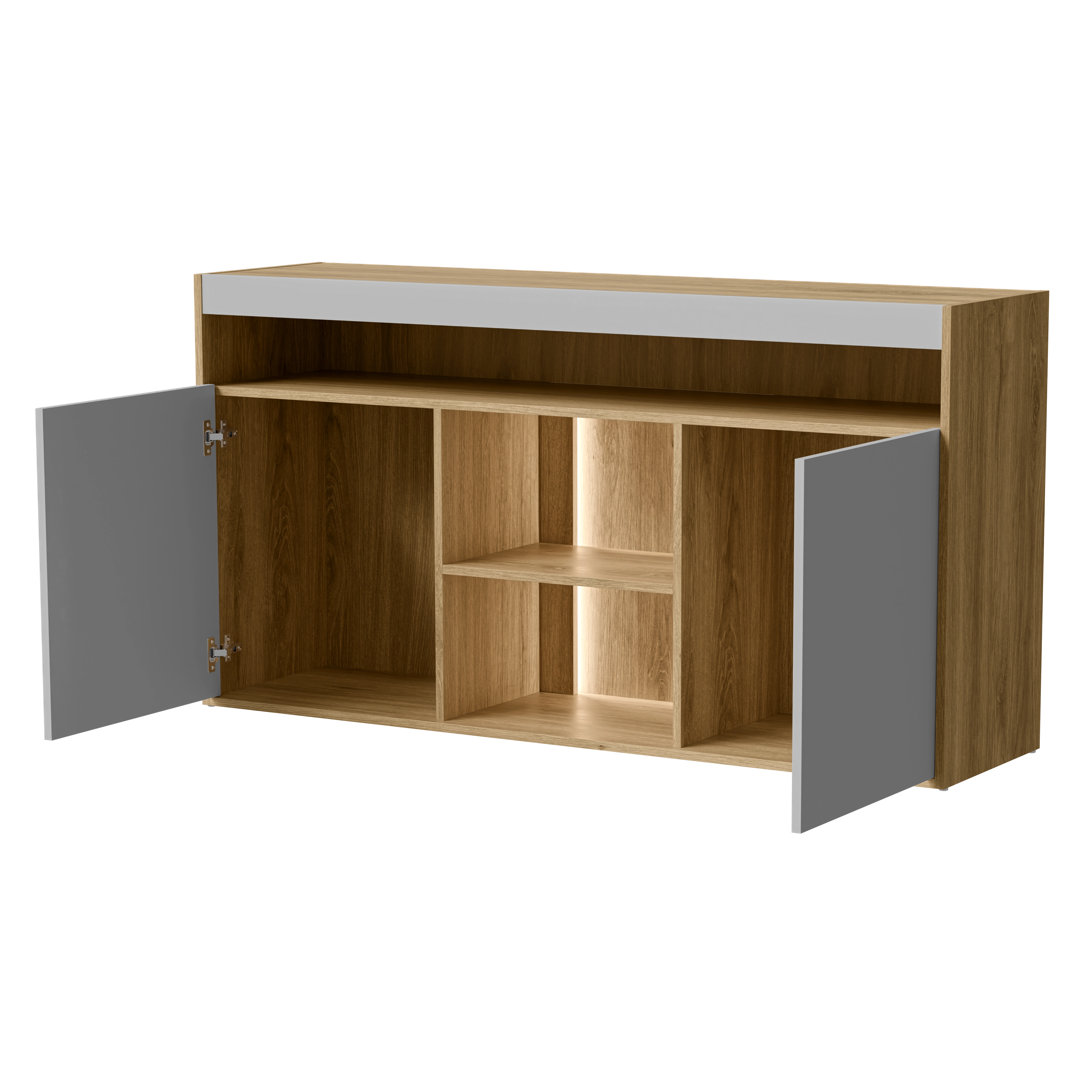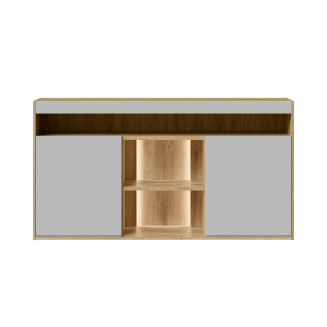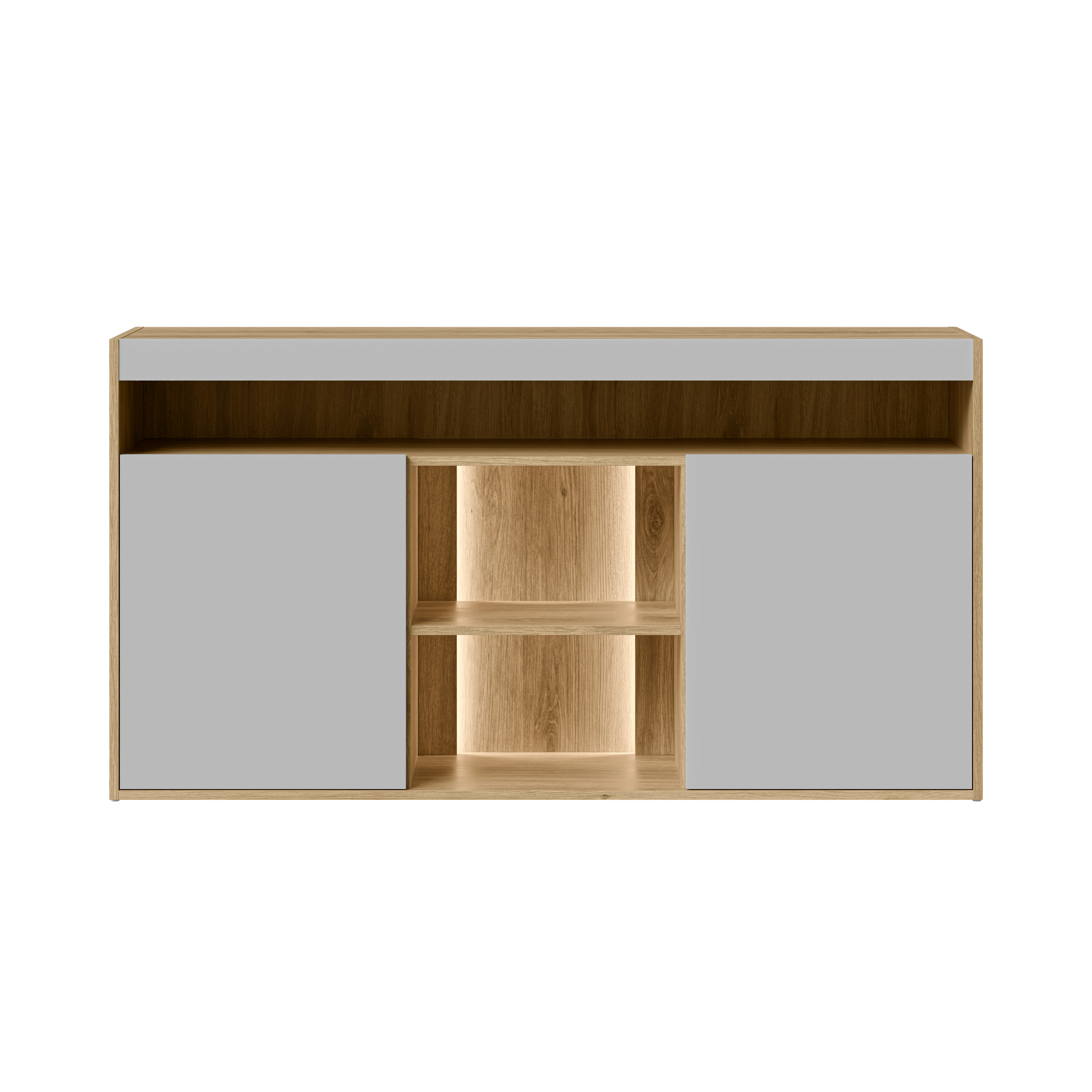Komoda FIORE 150 cm to wygodna komoda do salonu, która daje dużo miejsca na rzeczy i pomaga utrzymać porządek. Połączenie dębu tajga i szarego frontu wygląda spokojnie i pasuje do większości wnętrz. Mebel dobrze sprawdzi się tam, gdzie potrzebna jest jedna większa szafka zamiast kilku małych.