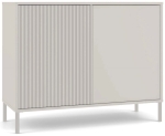 Ta komoda kaszmir została zaprojektowana z myślą o osobach, które szukają połączenia prostoty i dekoracyjnego detalu. Fronty łączą gładką powierzchnię z ryflowanym wzorem, co nadaje meblowi charakter i wyróżnia go na tle klasycznych modeli. Wnętrze za drzwiami pozwala przechowywać różne rzeczy w uporządkowany sposób. Dzięki temu komoda beżowa sprawdzi się w salonie, sypialni lub przedpokoju.