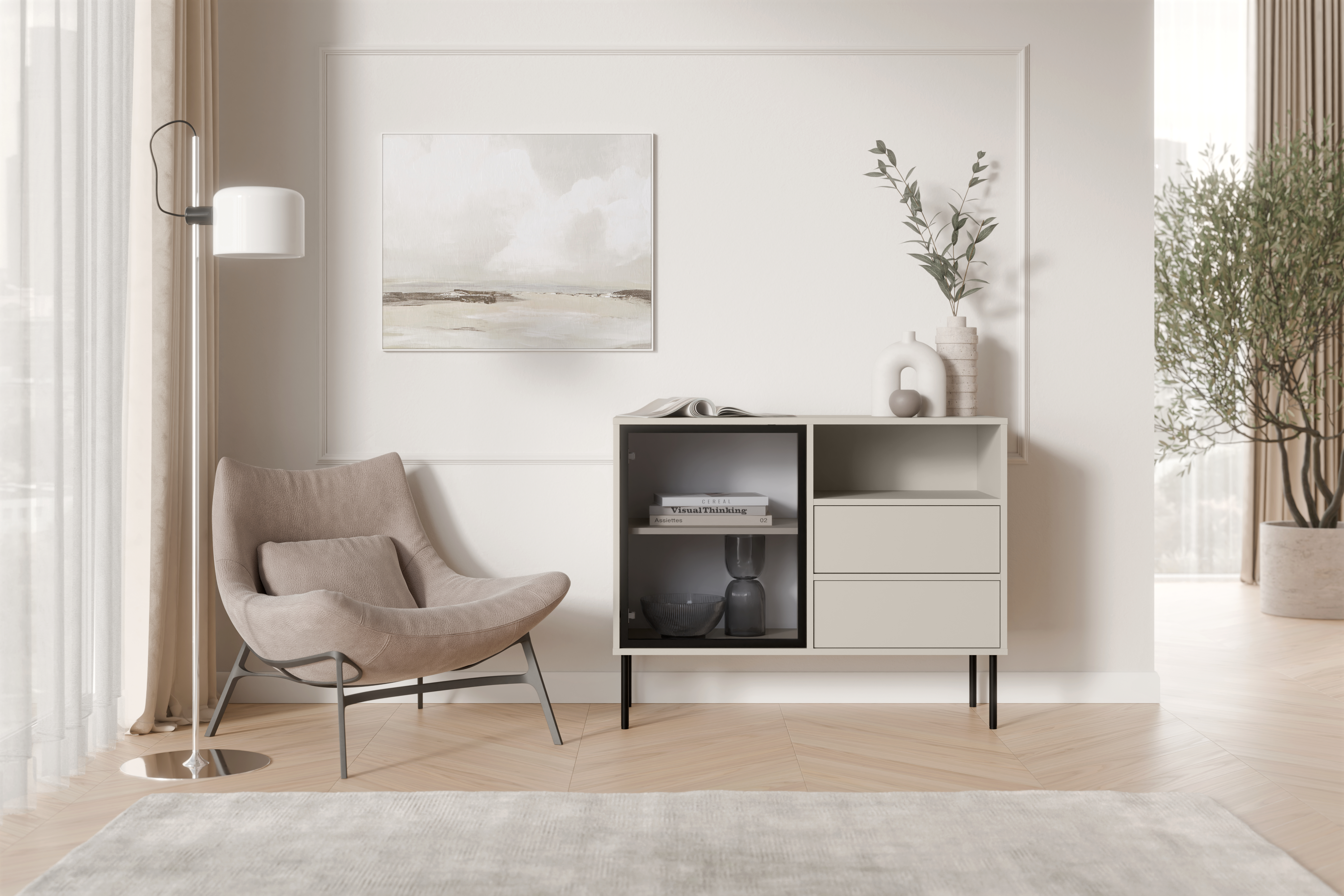 Komoda Kaszmir DOMI 1D2S to nowoczesny mebel zaprojektowany z myślą o wnętrzach, w których liczy się lekkość formy i wyrazisty detal. Kaszmirowy, beżowy odcień połączony z czarnymi, wysokimi nóżkami oraz aluminiową ramką tworzy elegancką i spójną całość. To idealna propozycja dla osób poszukujących funkcjonalnej i estetycznej komody kaszmirowej.