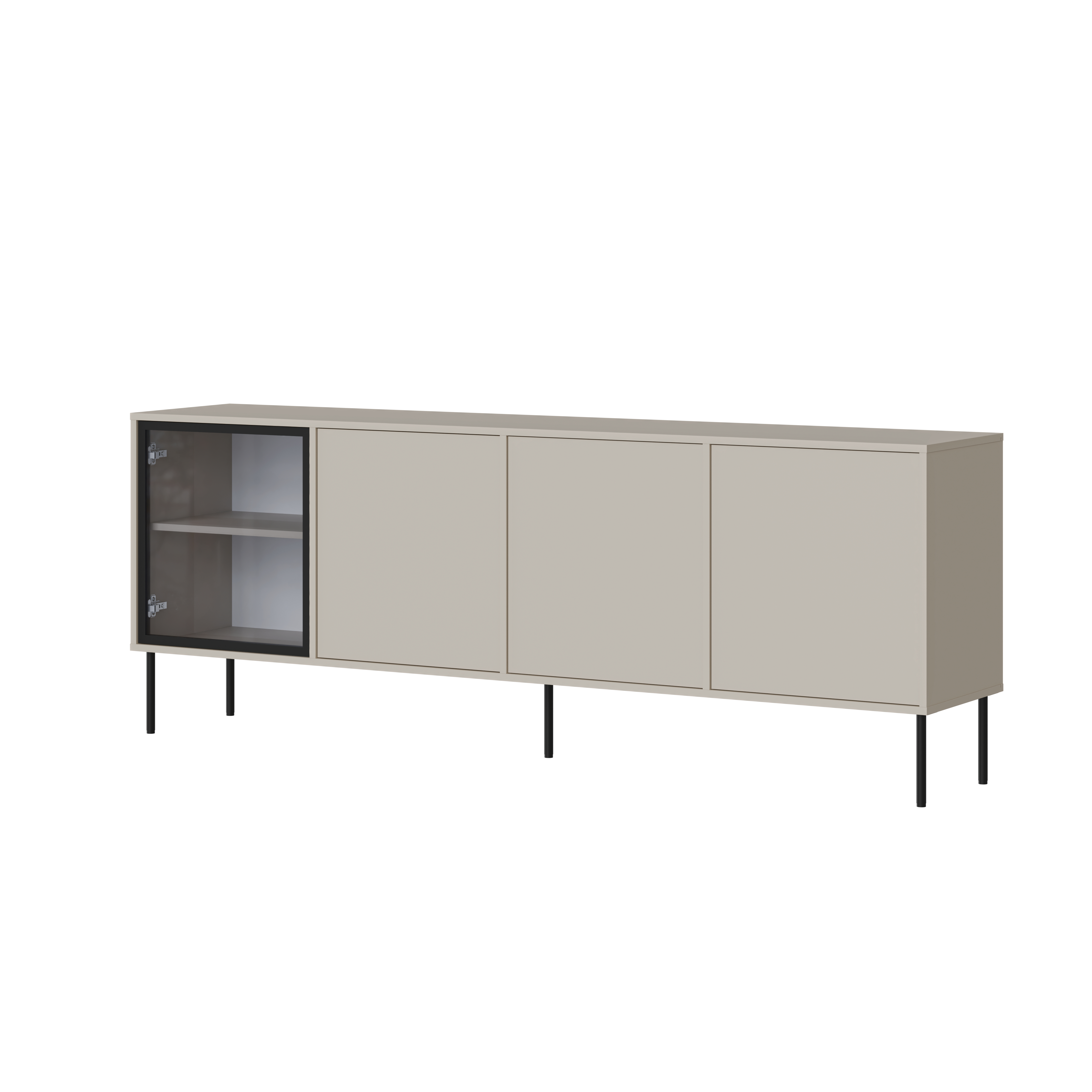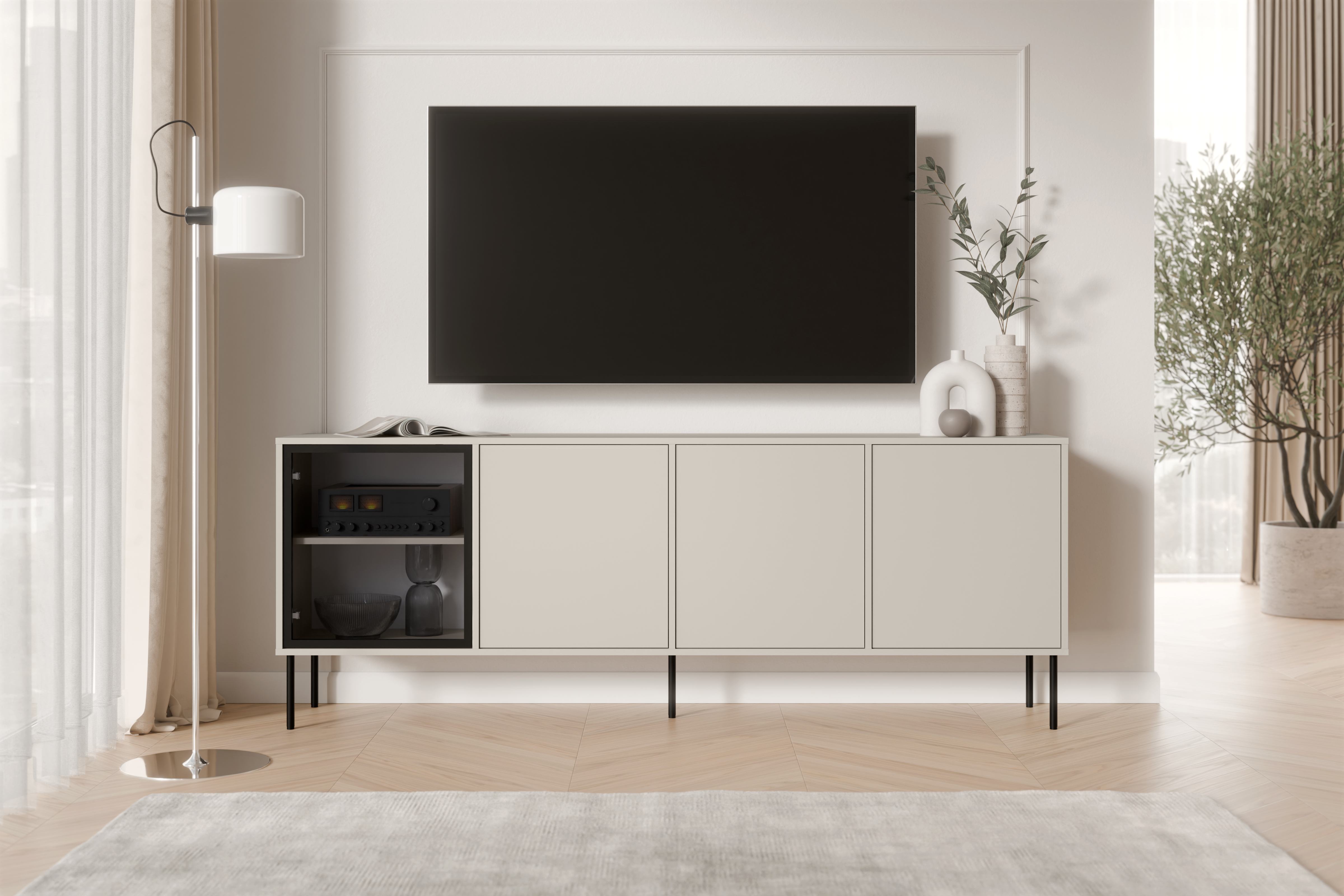 Prosta, wydłużona bryła doskonale komponuje się z aranżacją strefy telewizyjnej, tworząc spójne i uporządkowane tło dla nowoczesnego wnętrza. Matowe fronty w kolorze kaszmiru nadają całości subtelnej elegancji, a czarne, smukłe nóżki wprowadzają kontrast i wizualną lekkość. Dzięki temu komoda kaszmir DOMI 4D idealnie odnajduje się w salonach urządzonych w stylu nowoczesnym, minimalistycznym oraz soft loft.