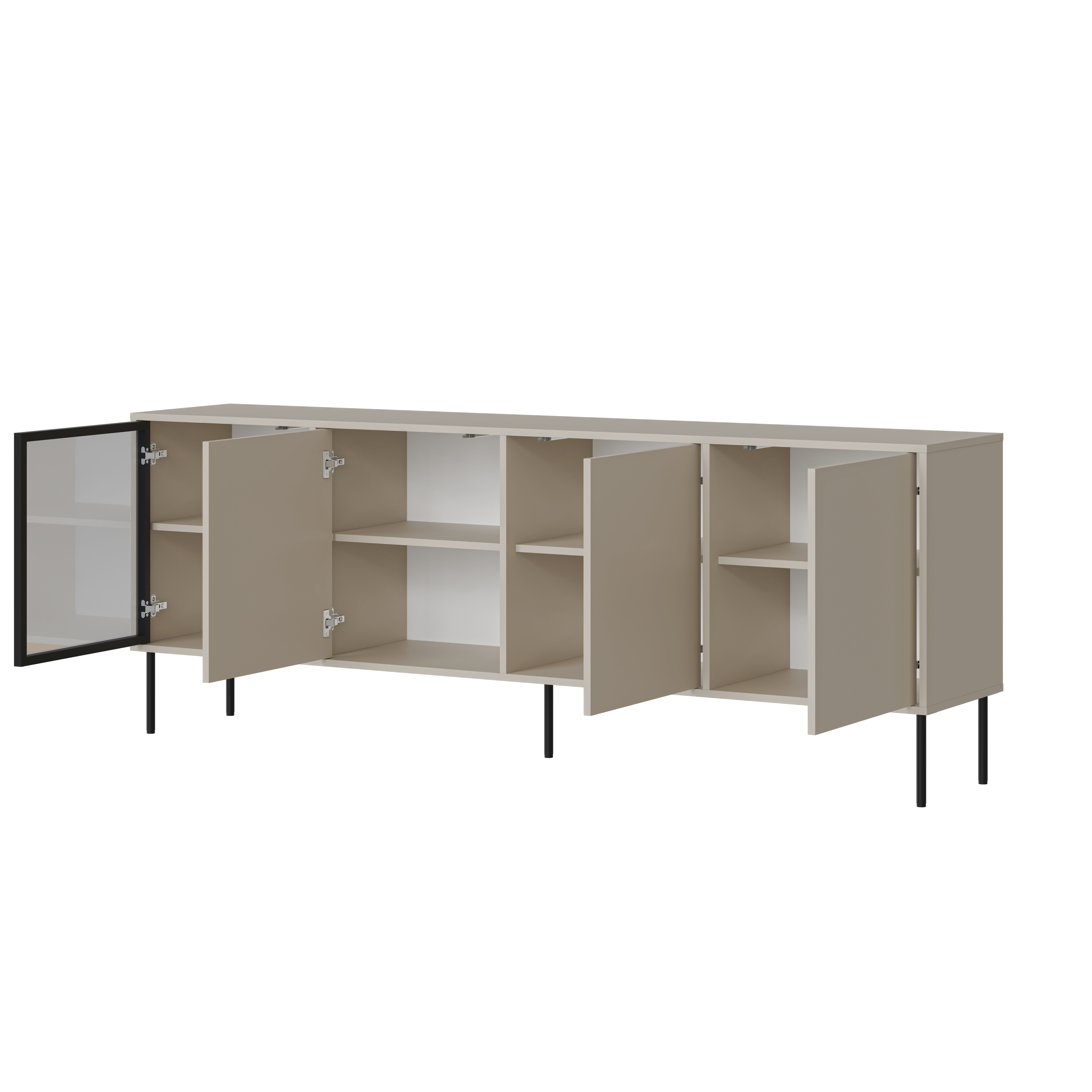 Wnętrze mebla zostało zaprojektowane z myślą o wygodnym przechowywaniu i zachowaniu estetycznego porządku w salonie. Cztery fronty otwierane do boku kryją praktyczne półki, które pozwalają uporządkować sprzęt RTV, dokumenty lub domowe akcesoria. Dzięki temu nowoczesna komoda do salonu DOMI 4D łączy funkcję przechowywania z reprezentacyjną rolą mebla strefy dziennej.