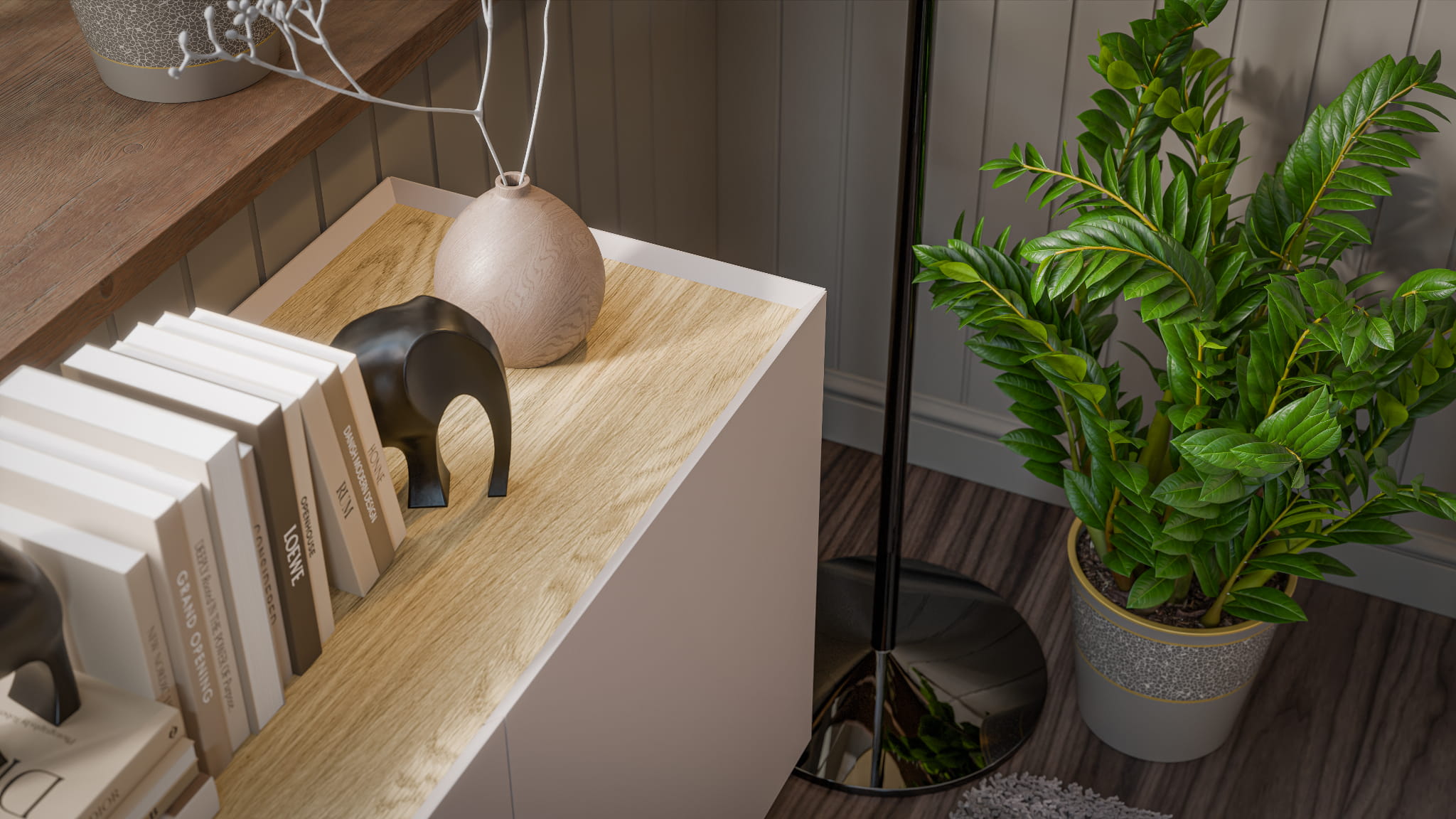 Prosta bryła została wzbogacona o wpuszczony blat oraz krawędzie ścięte pod kątem, które nadają meblowi wyrafinowanego charakteru i wizualnej lekkości. Naturalny blat z dębu olejowanego ociepla formę i pięknie kontrastuje z kaszmirowym matem frontów. Dzięki temu komoda kaszmir FELLINI idealnie wpisuje się w aranżacje skandynawskie, japandi oraz nowoczesne wnętrza premium.