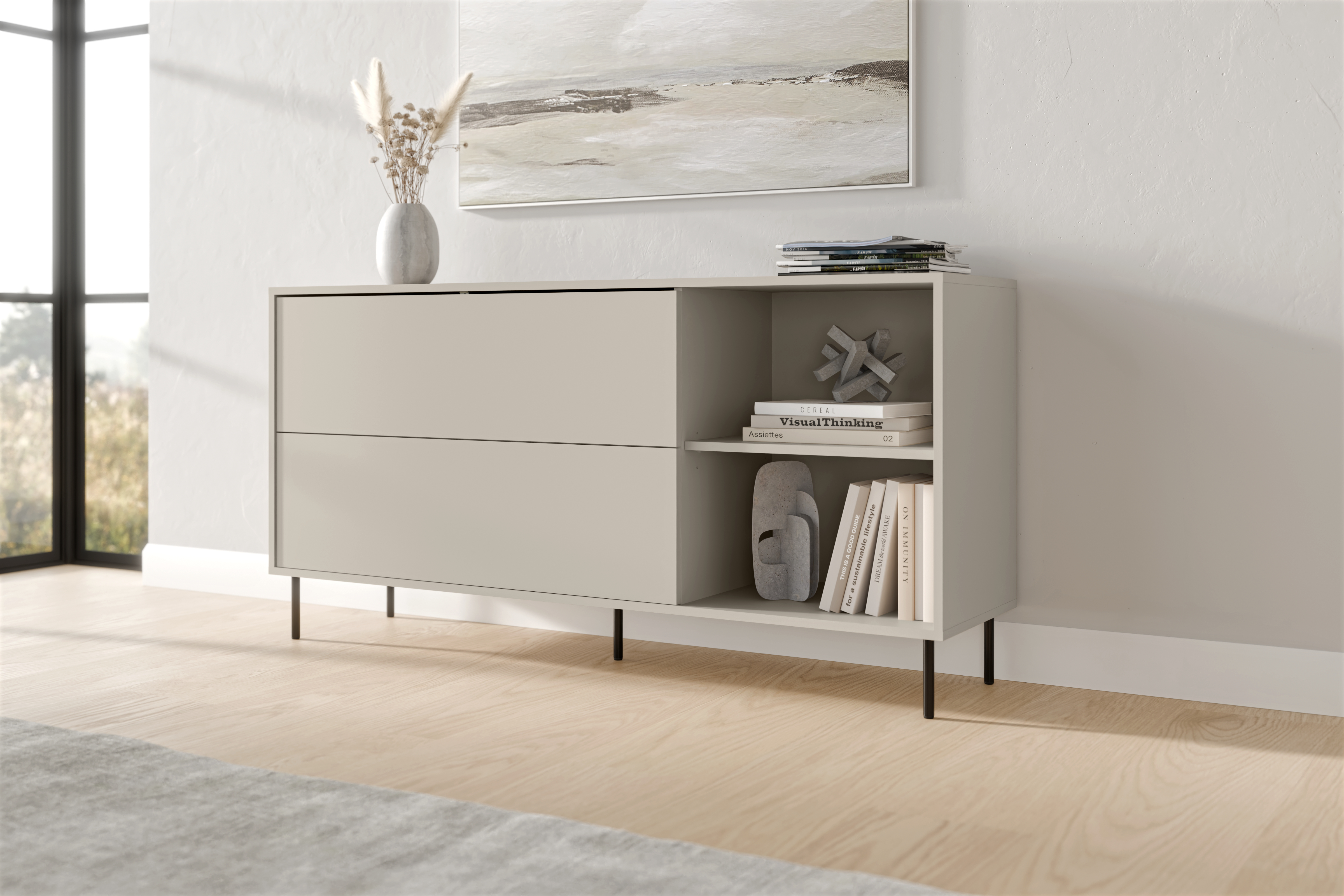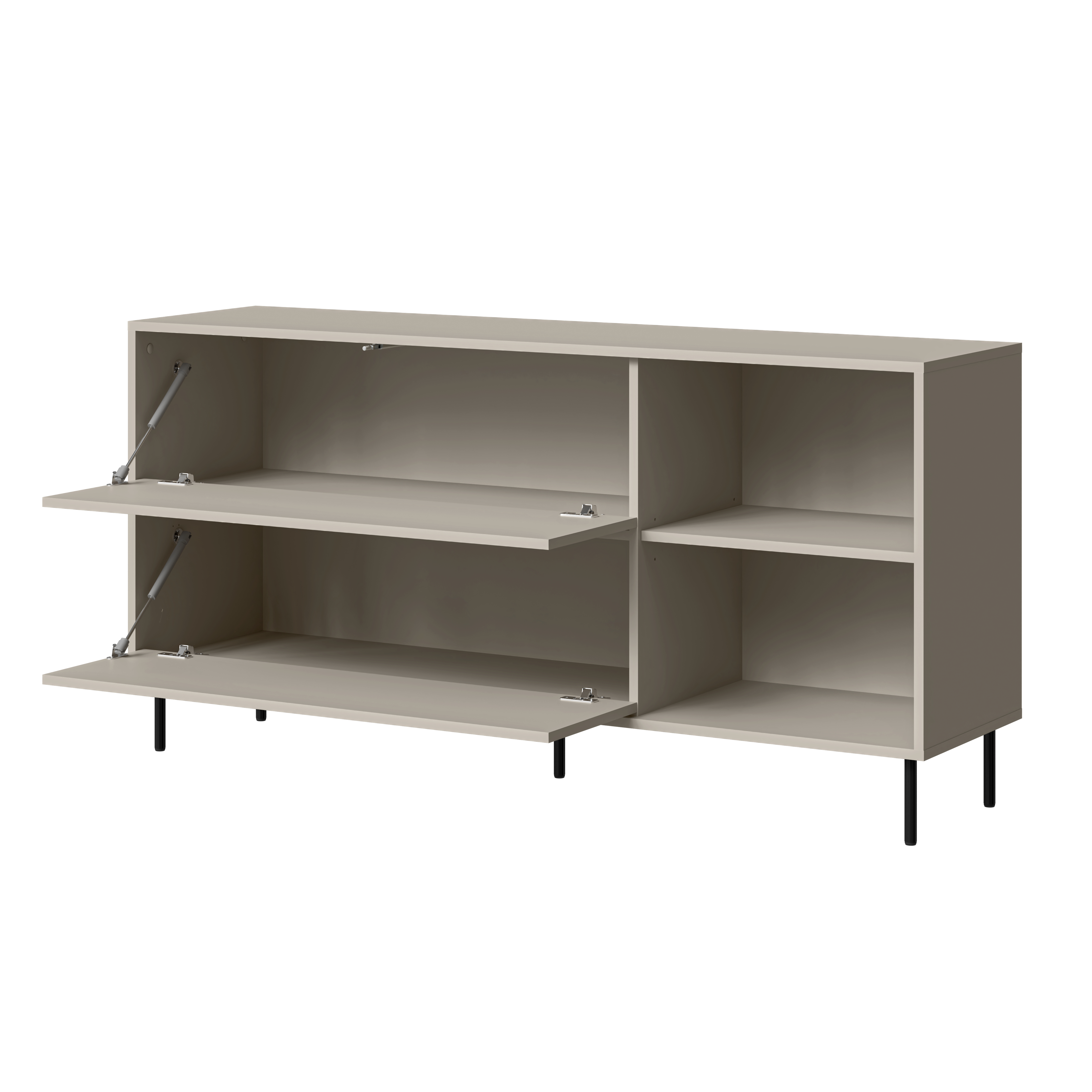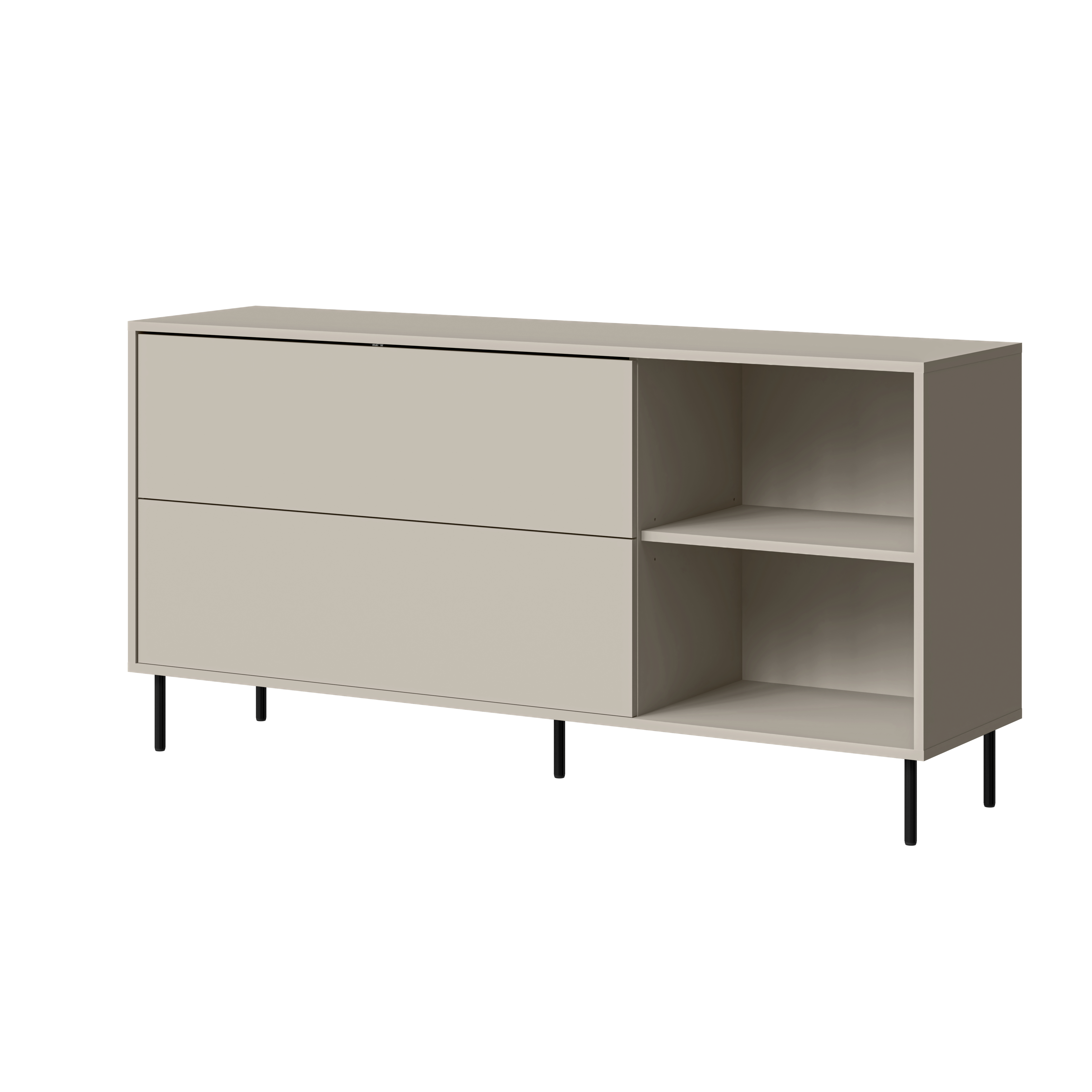 Komoda kaszmir MASHA 150 2D2P to elegancka propozycja do nowoczesnych wnętrz, w której prostota formy spotyka się z subtelną kolorystyką kaszmiru. Gładkie fronty, smukłe metalowe nóżki oraz otwarte półki nadają bryle lekkości i harmonii. To idealny wybór dla osób poszukujących stylowej i funkcjonalnej komody beżowej.