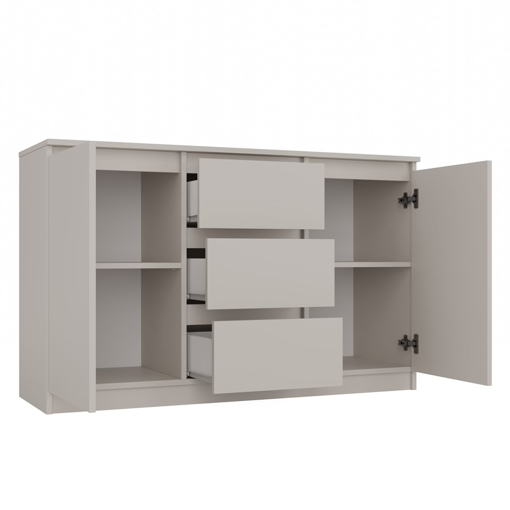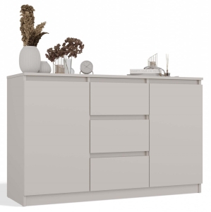 Model MEGAN 2D3S to praktyczna komoda kaszmir z szufladami i szafkami, która łączy różne sposoby przechowywania w jednym meblu. Trzy szuflady sprawdzą się na drobne rzeczy, a boczne szafki pozwalają schować większe przedmioty. Szerokość 120 cm daje dużą przestrzeń użytkową bez zajmowania całego pomieszczenia. Dzięki temu komoda z szufladami kaszmir to dobre rozwiązanie do salonu, sypialni lub przedpokoju.