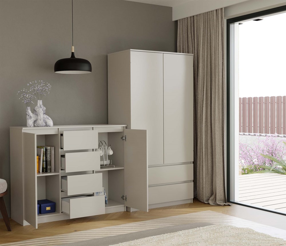 Mebel wykonano z płyty laminowanej o grubości 16 mm, co zapewnia odporność na codzienne użytkowanie. Stabilna konstrukcja gwarantuje komfort i bezpieczeństwo użytkowania przez długi czas. Proporcje zostały zaprojektowane tak, aby komoda była pojemna, ale nadal lekka wizualnie. Duża komoda kaszmirowa do salonu i sypialni to połączenie funkcjonalności i estetyki.