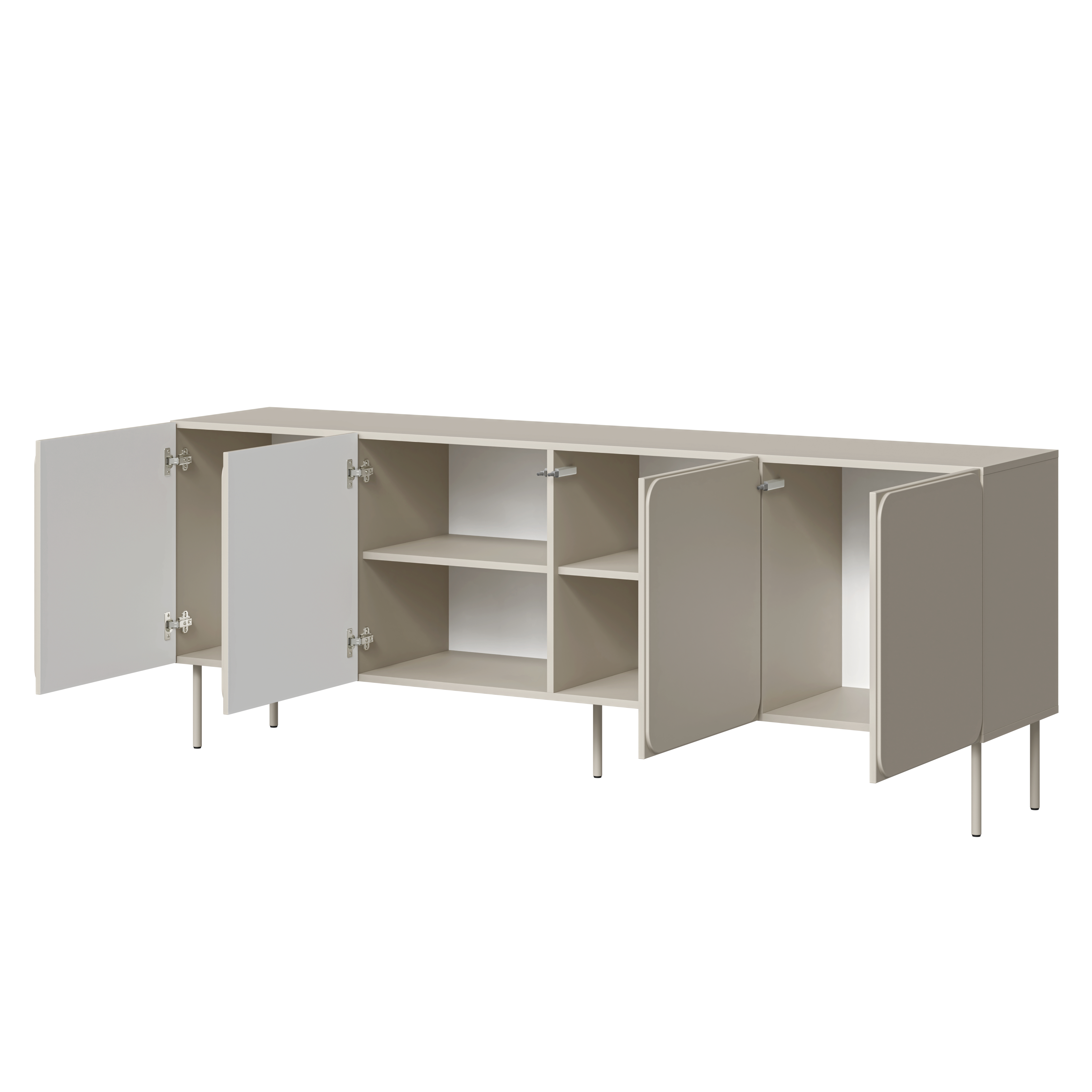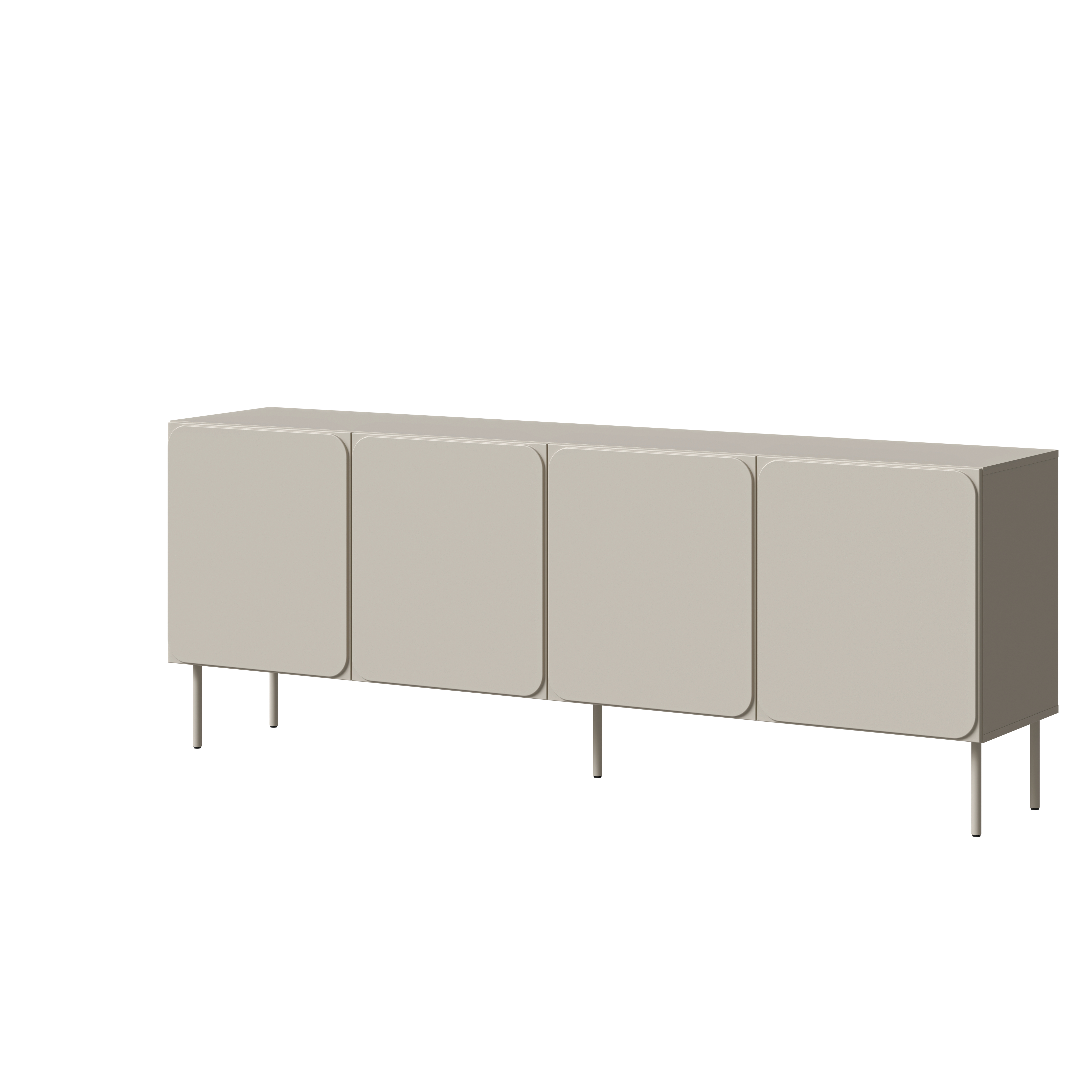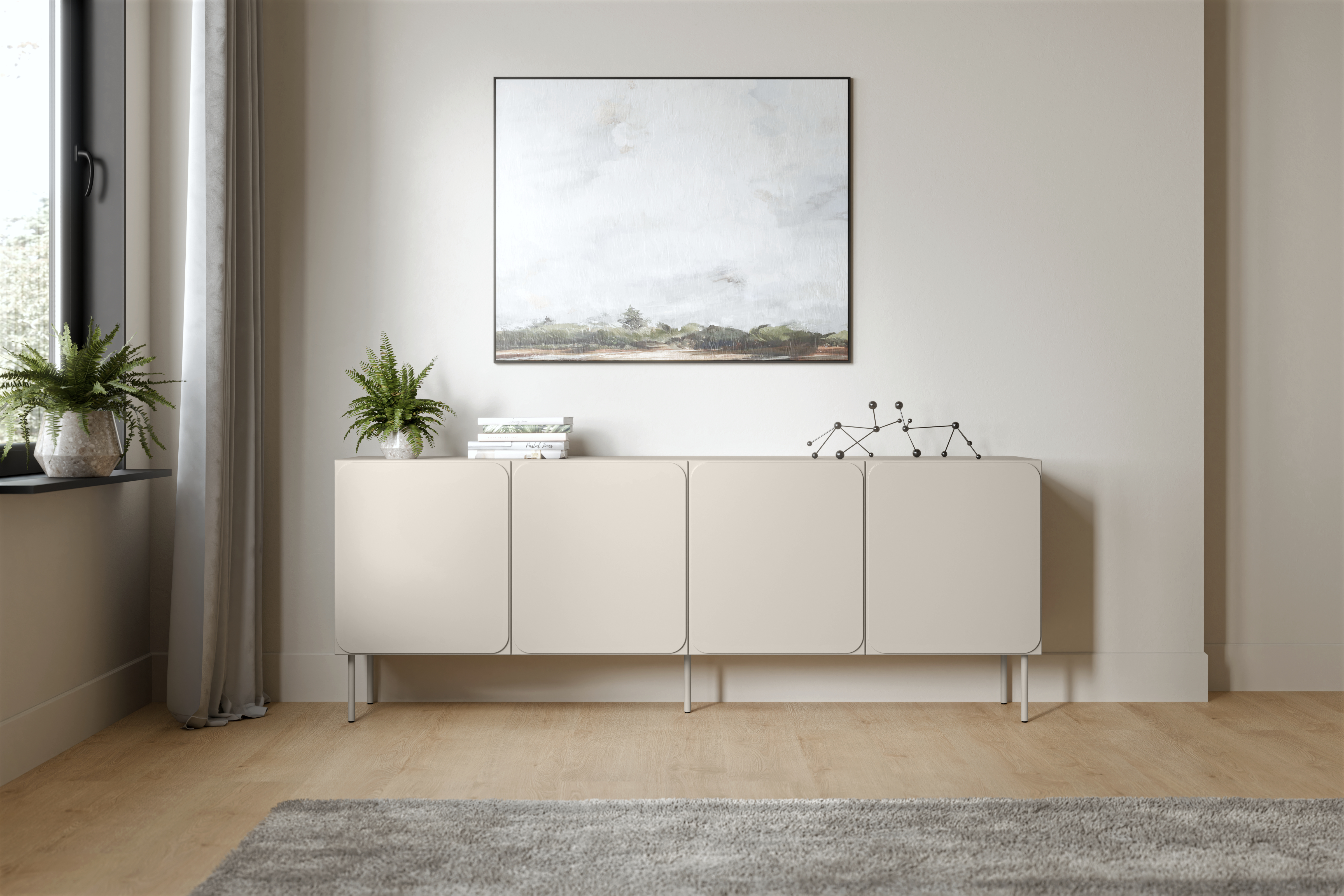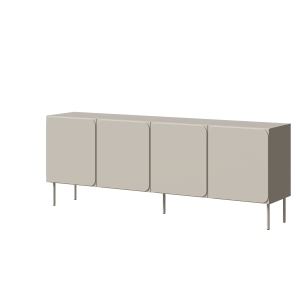 Cztery fronty otwierane do boków tworzą spokojną, symetryczną kompozycję, która nie przytłacza przestrzeni. Matowe wykończenie frontów w beżowym odcieniu podkreśla elegancki charakter mebla, a smukłe nóżki w kolorze całości dodają wizualnej lekkości. Dzięki temu komoda kaszmirowa RAFAEL idealnie odnajduje się w aranżacjach nowoczesnych, contemporary oraz soft minimal.
