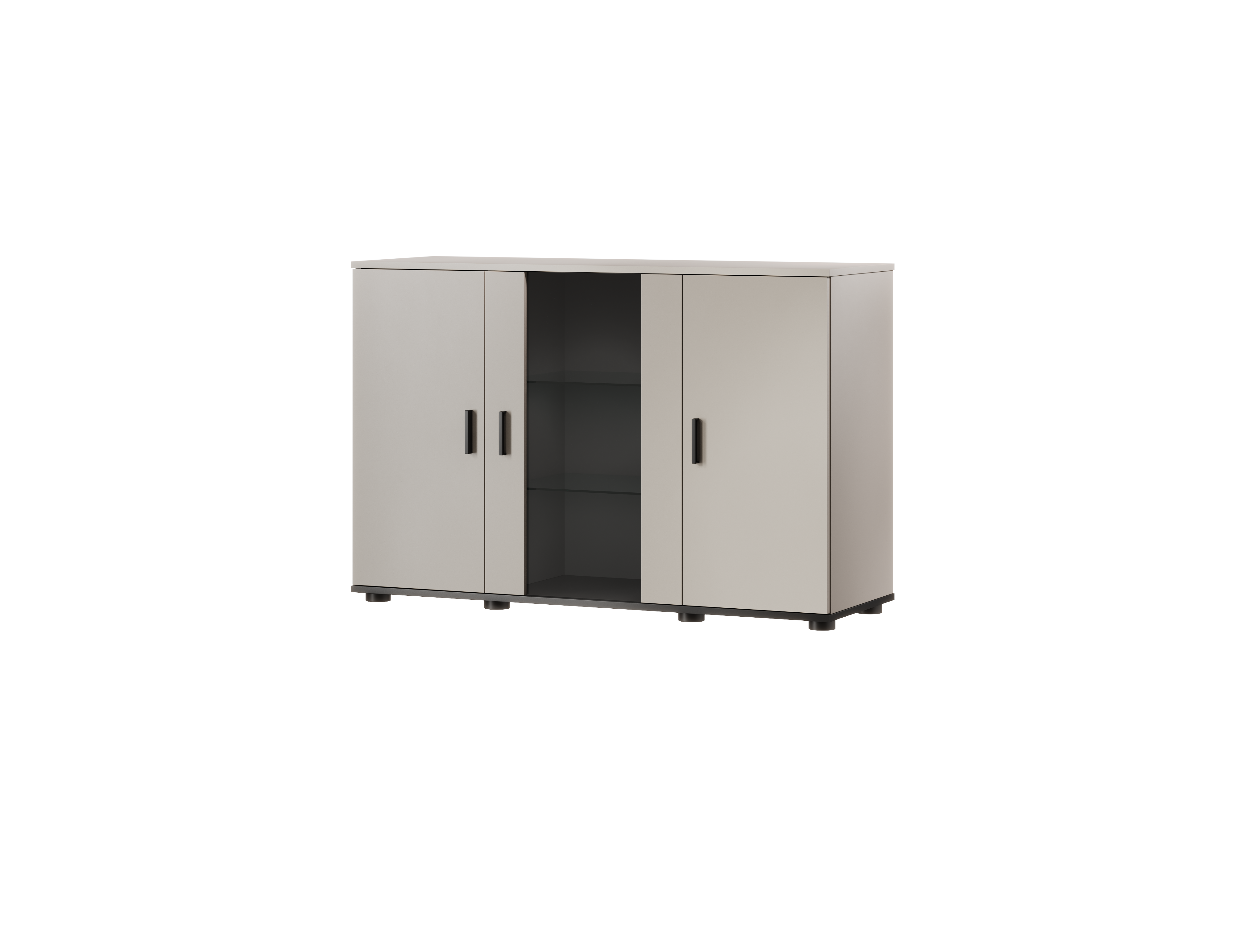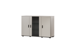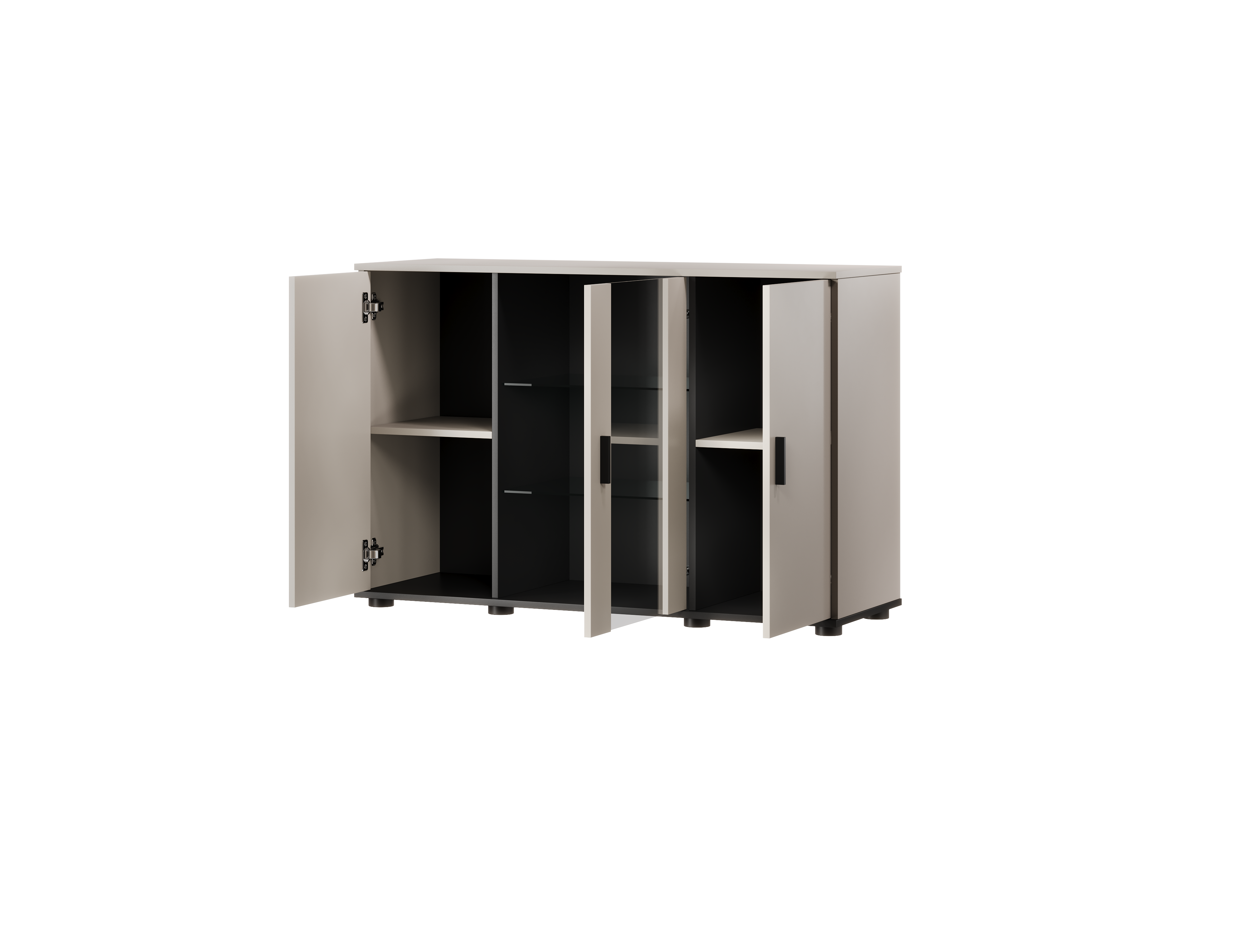 Połączenie matowego kaszmiru z czarnymi akcentami tworzy harmonijną i nowoczesną całość. Gładkie fronty, czarne uchwyty oraz przeszklona część z podświetleniem LED podkreślają dekoracyjny charakter mebla. To doskonała propozycja do wnętrz, w których komoda kaszmirowa ma pełnić nie tylko funkcję praktyczną, ale również reprezentacyjną.