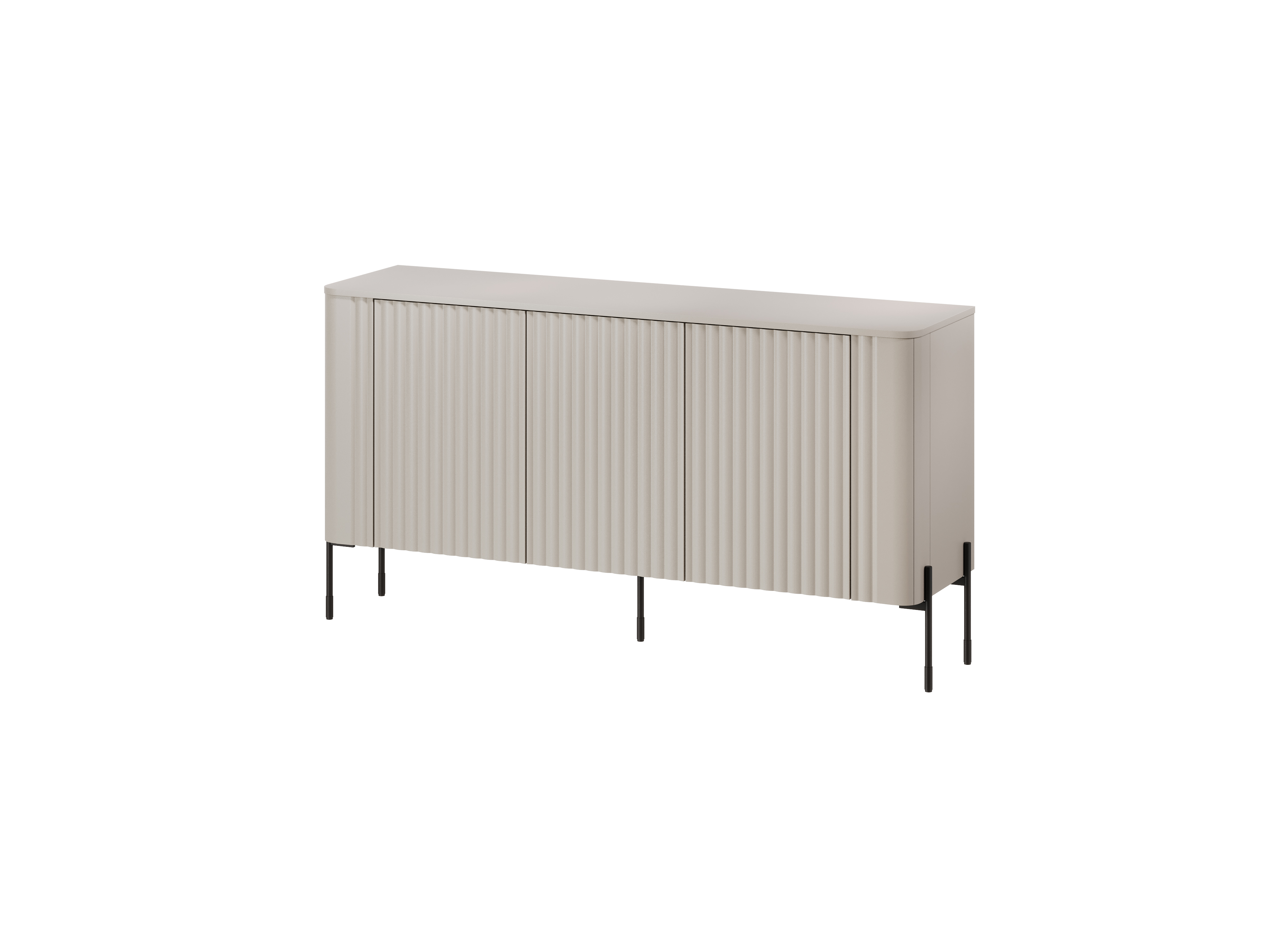 Komoda Kaszmir VERA II to elegancki mebel o miękkiej, zaokrąglonej formie, który subtelnie przełamuje geometryczne aranżacje wnętrz. Ryflowane, matowe fronty w kolorze kaszmiru oraz smukłe czarne nóżki nadają jej nowoczesny i lekki charakter. To idealna propozycja dla osób poszukujących stylowej komody ryflowanej do wnętrz premium.