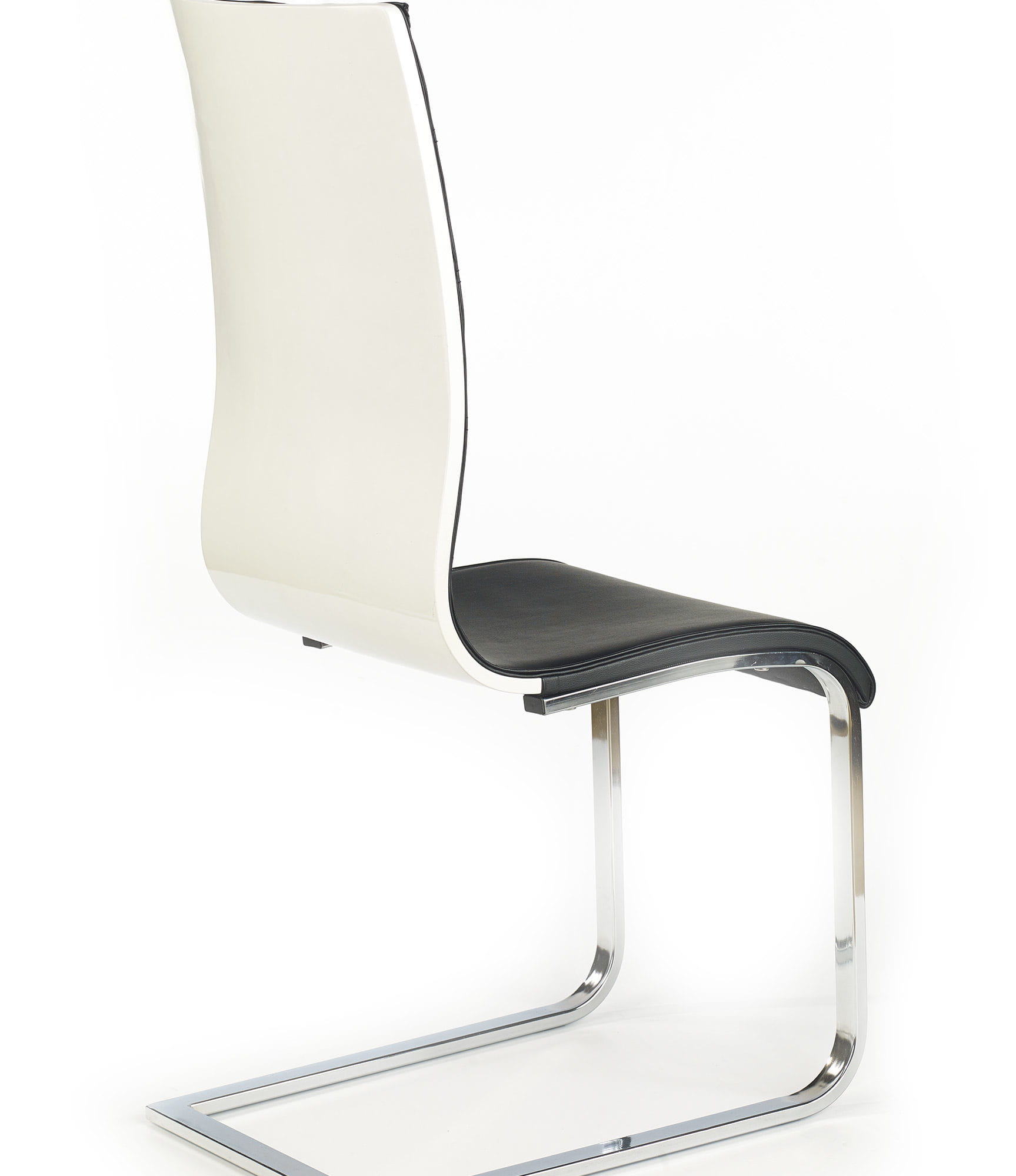 To czarne krzesło wyróżnia się dynamiczną linią oraz charakterystyczną podstawą na płozie, która nadaje mu lekkości wizualnej i nowoczesnego charakteru. Smukła konstrukcja sprawia, że model prezentuje się elegancko, nie przytłaczając przestrzeni. Połączenie czerni z białym tyłem tworzy kontrastowy, designerski efekt. To idealny wybór do wnętrz o współczesnym stylu.