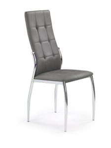 Krzesło szare K209 to nowoczesny mebel do jadalni, który łączy wygodę z elegancką formą. Krzesło tapicerowane szare wyróżnia się wysokim oparciem z dekoracyjnym pikowaniem oraz stabilną konstrukcją na chromowanych nogach. Doskonale odnajduje się w aranżacjach nowoczesnych, loftowych i minimalistycznych.