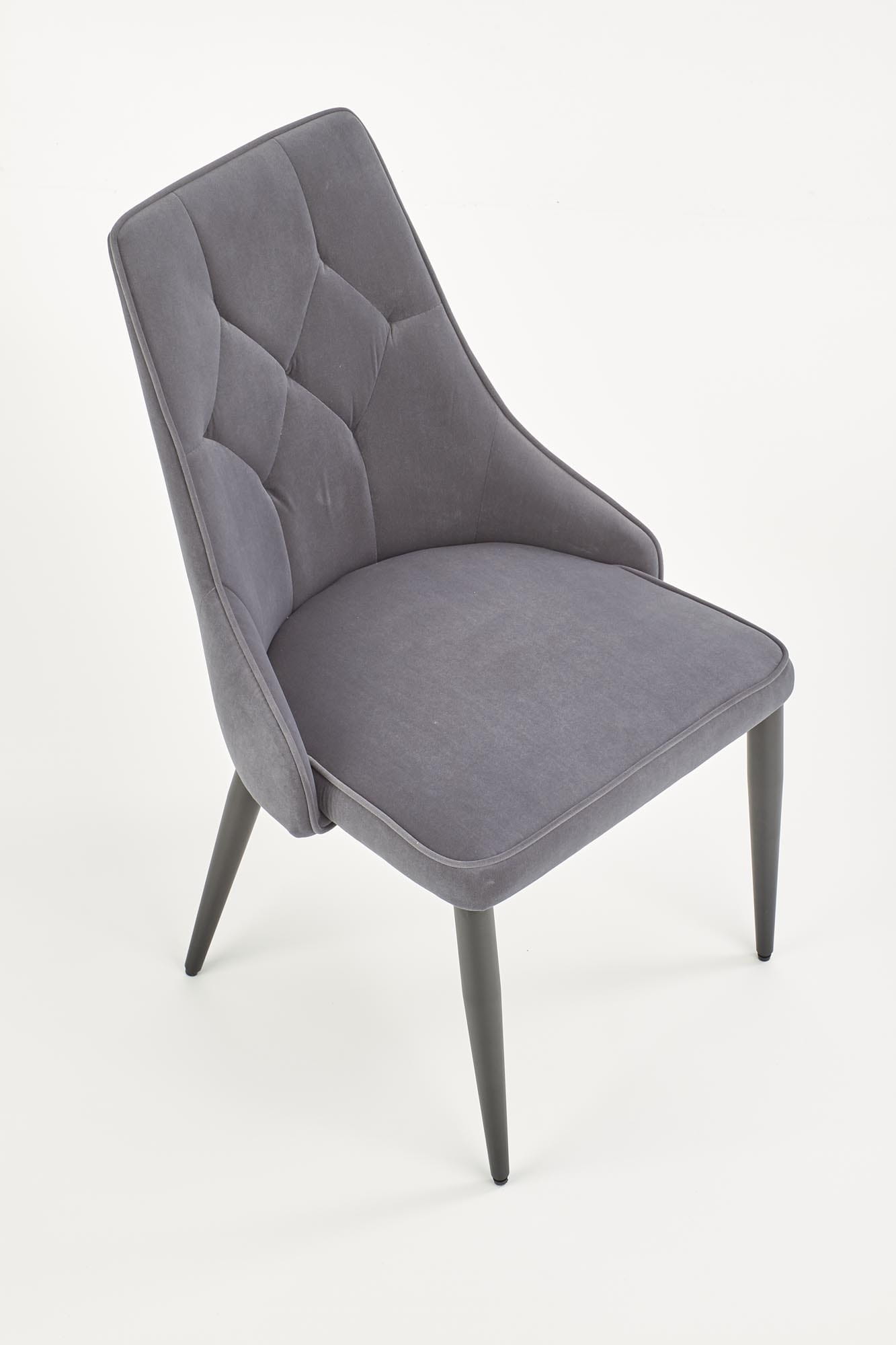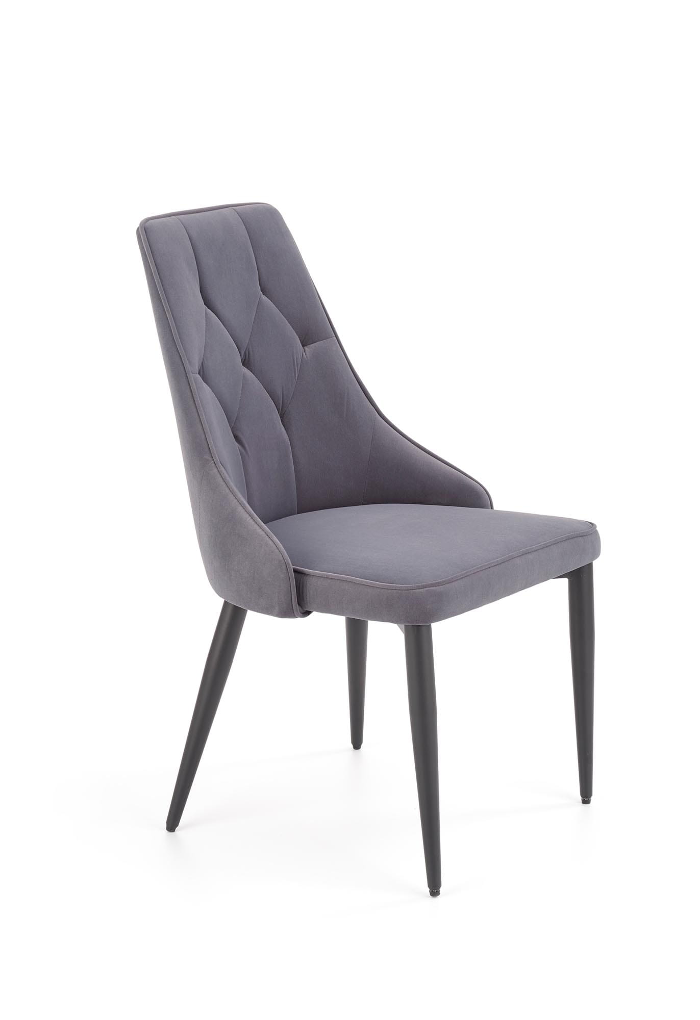 Krzesło szare K365 to elegancki model o smukłej sylwetce i subtelnym, dekoracyjnym oparciu. Miękka tapicerka velvet nadaje meblowi przyjemną w dotyku powierzchnię oraz podkreśla jego nowoczesny charakter. Dzięki swojej stonowanej kolorystyce krzesło szare wprowadza do wnętrza spokojną elegancję i ponadczasowy styl.