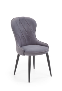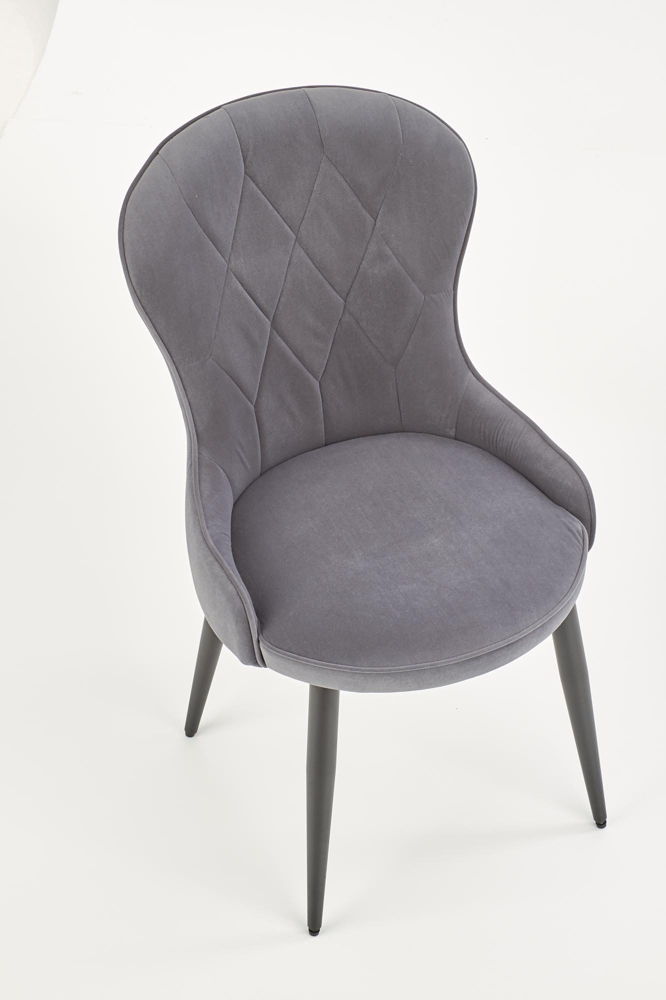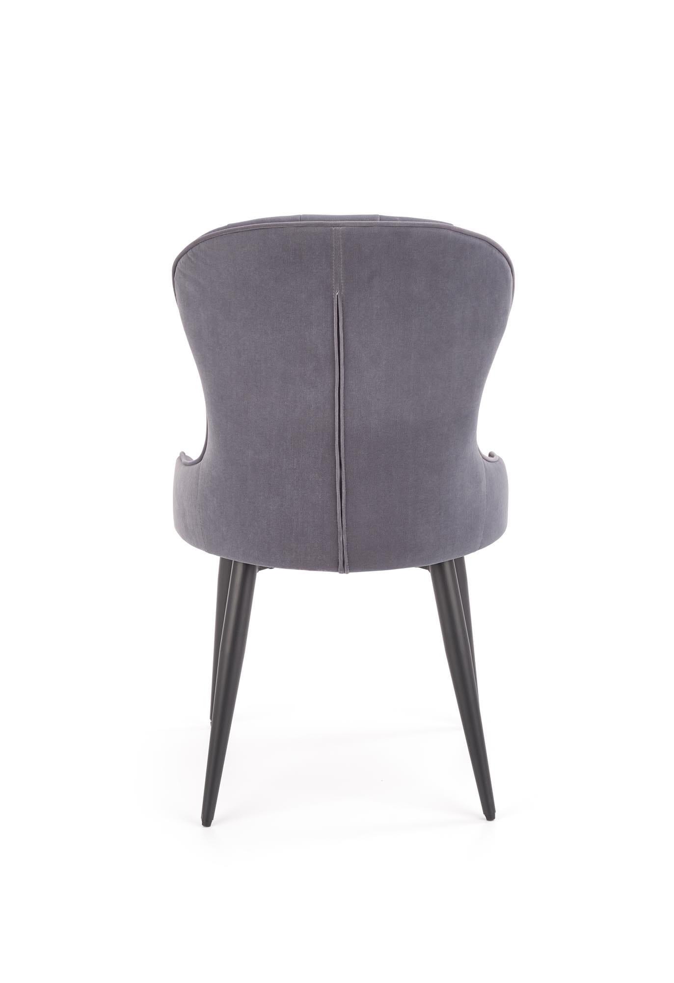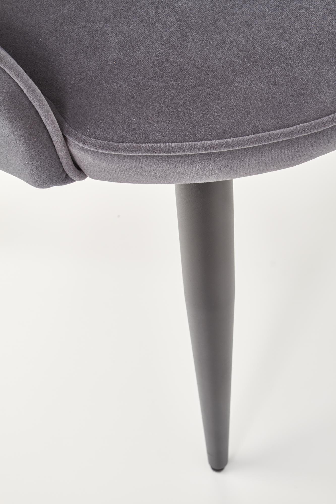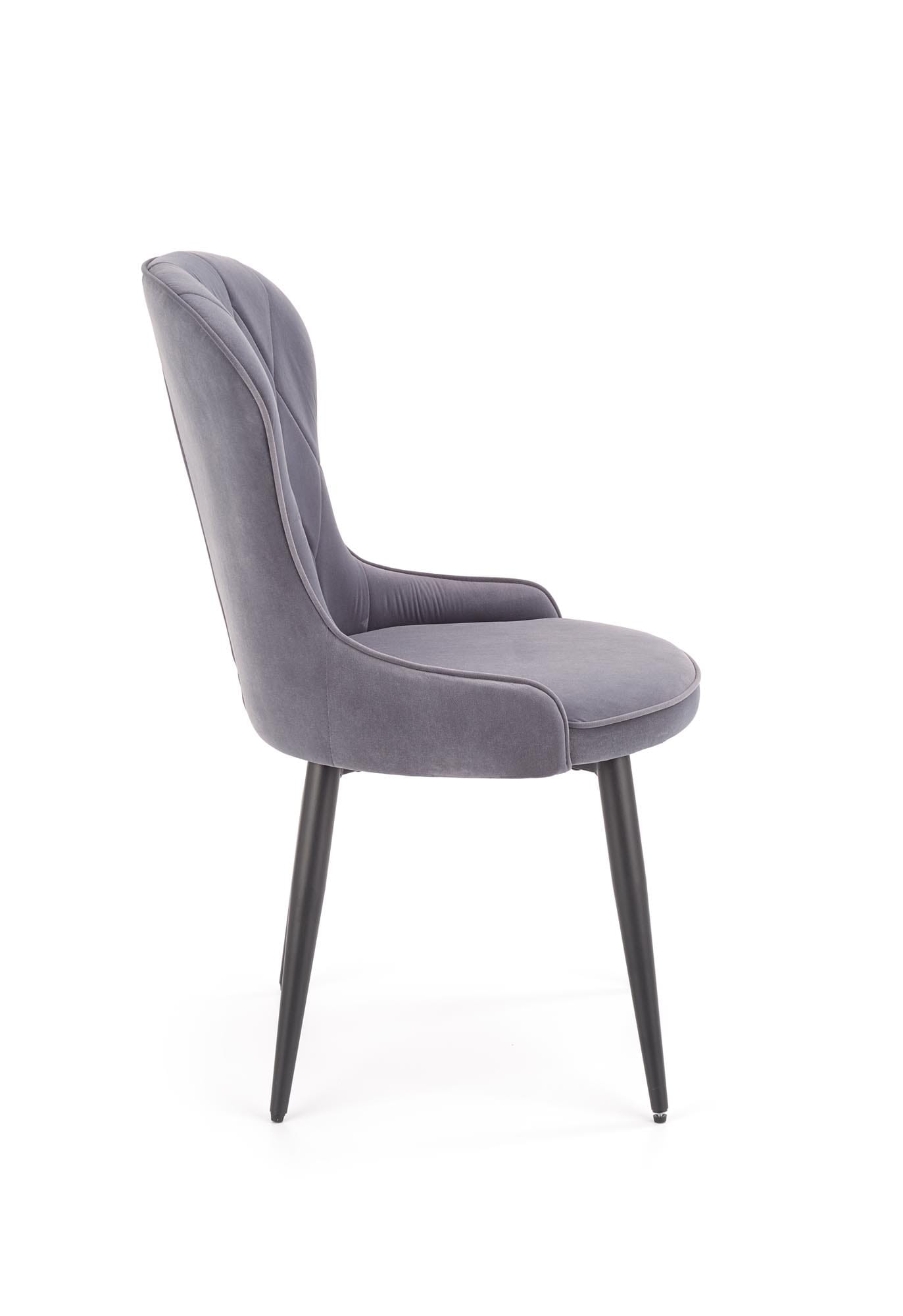 Model K366 wyróżnia się wysokim oparciem oraz dekoracyjnymi przeszyciami, które nadają mu elegancki charakter. Tapicerowane siedzisko wykonane z miękkiej tkaniny velvet jest przyjemne w dotyku i zapewnia komfort podczas codziennego użytkowania. Dzięki temu krzesło welurowe szare doskonale komponuje się z aranżacjami w stylu modern, glamour oraz soft minimal.