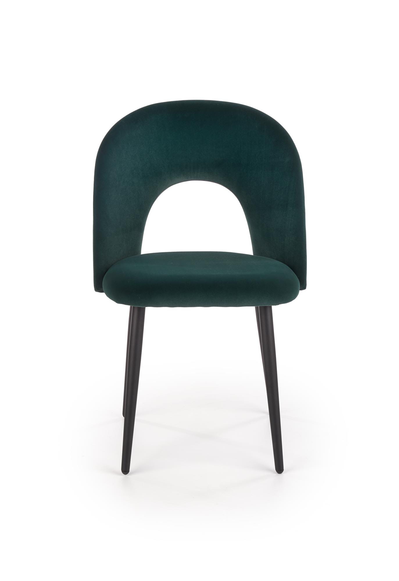 Model K384 wyróżnia się nowoczesną formą oraz charakterystycznym wycięciem w oparciu, które nadaje mu lekkości wizualnej. Tapicerowane siedzisko oraz miękka tkanina velvet zapewniają wygodę podczas codziennego użytkowania. Dzięki eleganckiej sylwetce i modnej kolorystyce to stylowe zielone krzesło świetnie sprawdzi się zarówno przy stole w jadalni, jak i w salonie czy eleganckim gabinecie.
