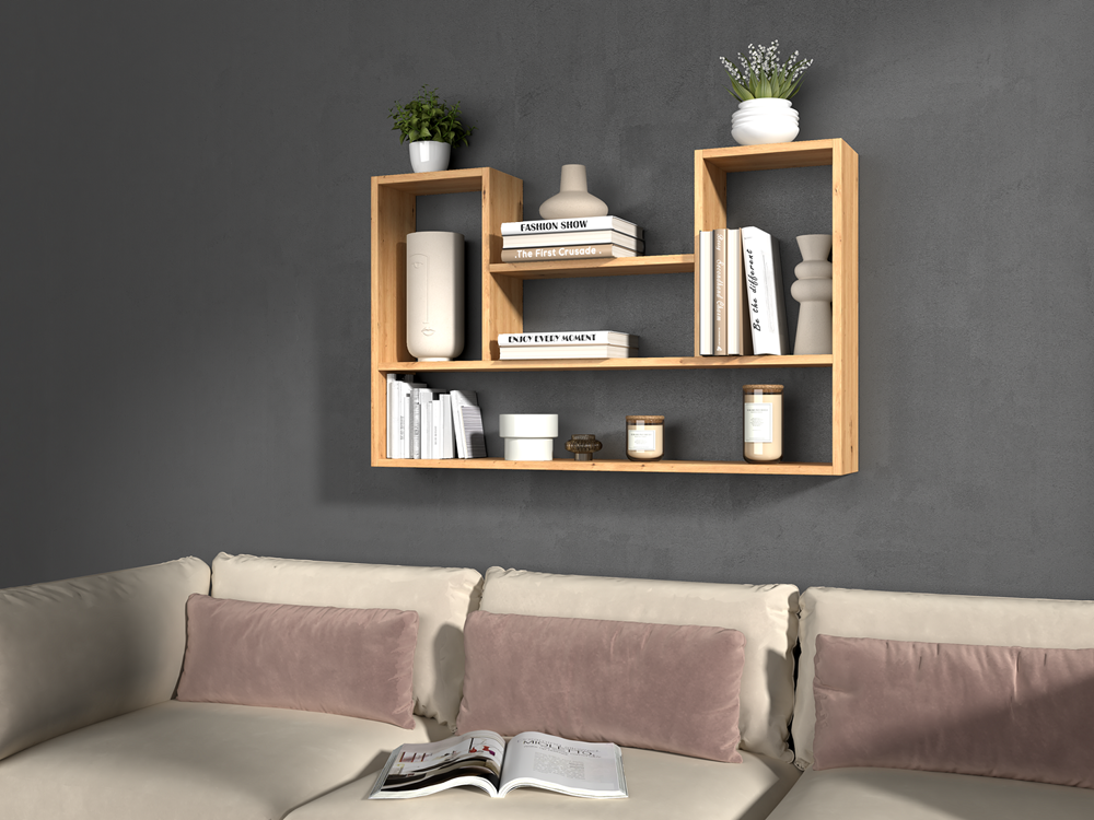 Ta półka wisząca została zaprojektowana tak, aby łączyć funkcję przechowywania z dekoracyjnym wyglądem. Różnorodny układ półek umożliwia tworzenie ciekawych kompozycji z książek, roślin i dodatków. Prosta, geometryczna forma sprawia, że model pasuje do wnętrz nowoczesnych, skandynawskich oraz minimalistycznych. Jeśli szukasz podobnych rozwiązań, zobacz także półkę FLORYDA.
