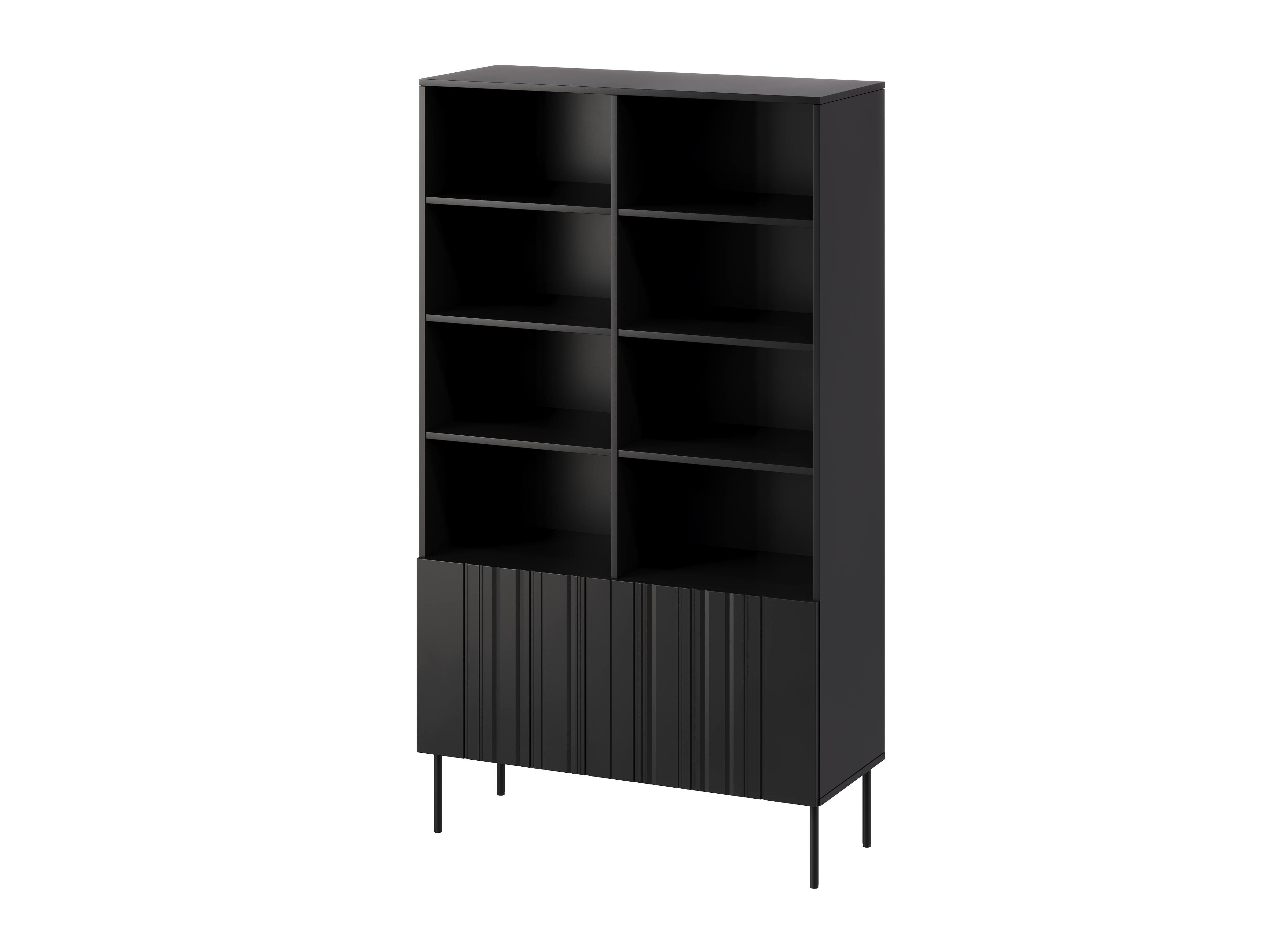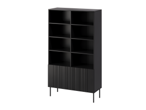 Starannie dobrane materiały gwarantują trwałość i komfort użytkowania. Czarny regał na książki został wykonany z laminowanej płyty korpusowej oraz ryflowanego frontu MDF w matowym wykończeniu. System push to open zapewnia wygodne użytkowanie i czystą, minimalistyczną formę bez uchwytów.