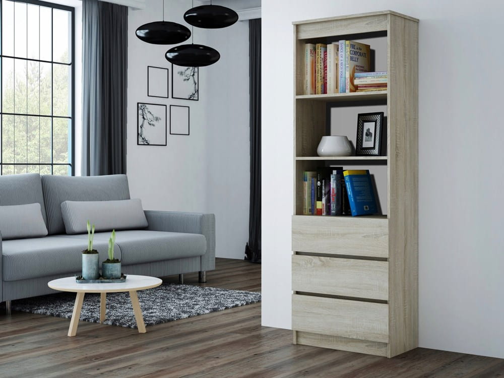 Niebanalny regał dąb sonoma GREG 60cm na książki czy ozdoby sprawdzi się w każdym mieszkaniu. Jest to mebel o dekoracyjnym charakterze, który będzie stanowił praktyczną ozdobę każdego wnętrza. Należy podkreślić, że został wyprodukowany z bardzo dobrych gatunkowo materiałów które wyróżniają się wysoką trwałością oraz odpornością na usterki. Regał na książki z szufladami dąb sonoma GREG jest przystosowana do wysokich obciążeń, co przekłada się na bezpieczeństwo użytkowania.