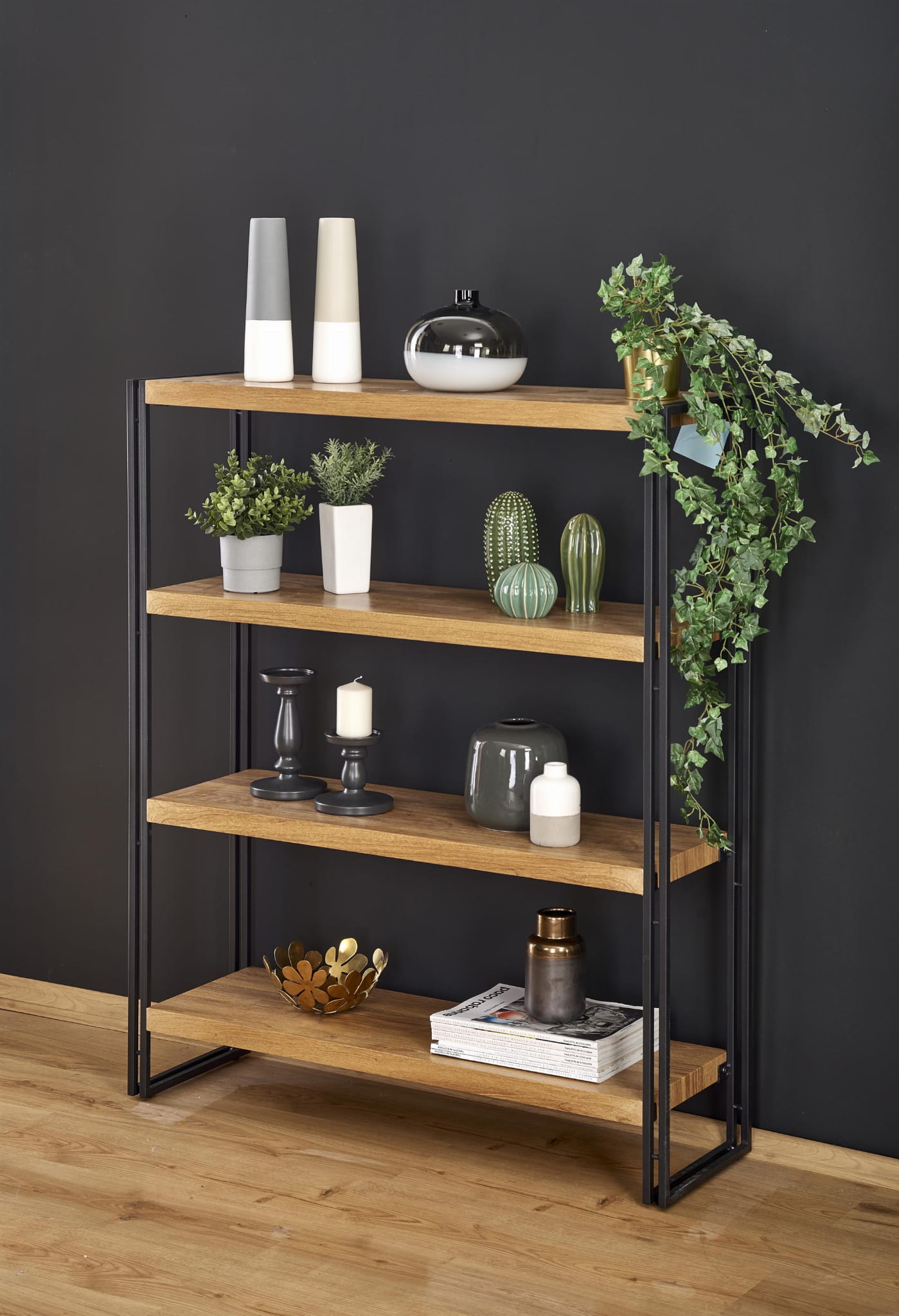 Model BOLIVAR to propozycja dla osób ceniących design inspirowany loftem oraz trwałość wykonania. Regały metalowe tego typu świetnie wpisują się w nowoczesne i industrialne aranżacje, oferując jednocześnie dużą przestrzeń do przechowywania. Sprawdź również regały na książki, aby dopasować idealny model do swojego wnętrza. Konstrukcja oparta na stalowej ramie zapewnia stabilność, a półki w dekorze dąb złoty ocieplają wizualnie całość.