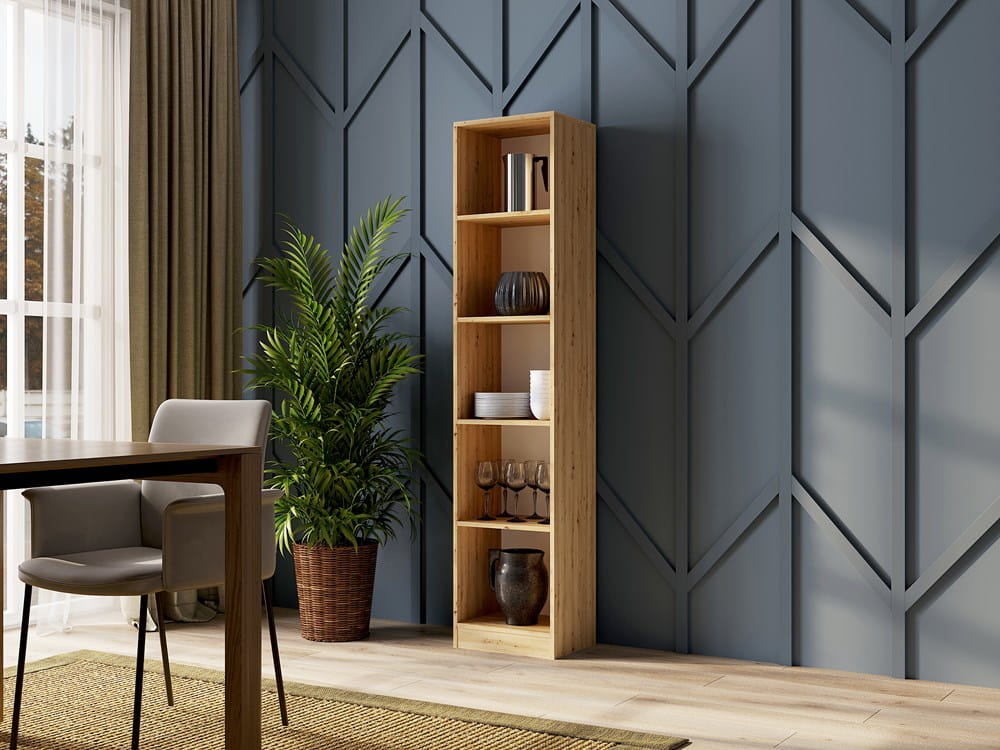 Niebanalny regał dąb artisan FOX 60cm na książki czy ozdoby sprawdzi się w każdym mieszkaniu. Jest to mebel o dekoracyjnym charakterze, który będzie stanowił praktyczną ozdobę każdego wnętrza. Należy podkreślić, że został wyprodukowany z bardzo dobrych gatunkowo materiałów które wyróżniają się wysoką trwałością oraz odpornością na usterki. Regał wysoki dąb artisan FOX 60cm jest przystosowana do wysokich obciążeń, co przekłada się na bezpieczeństwo użytkowania.