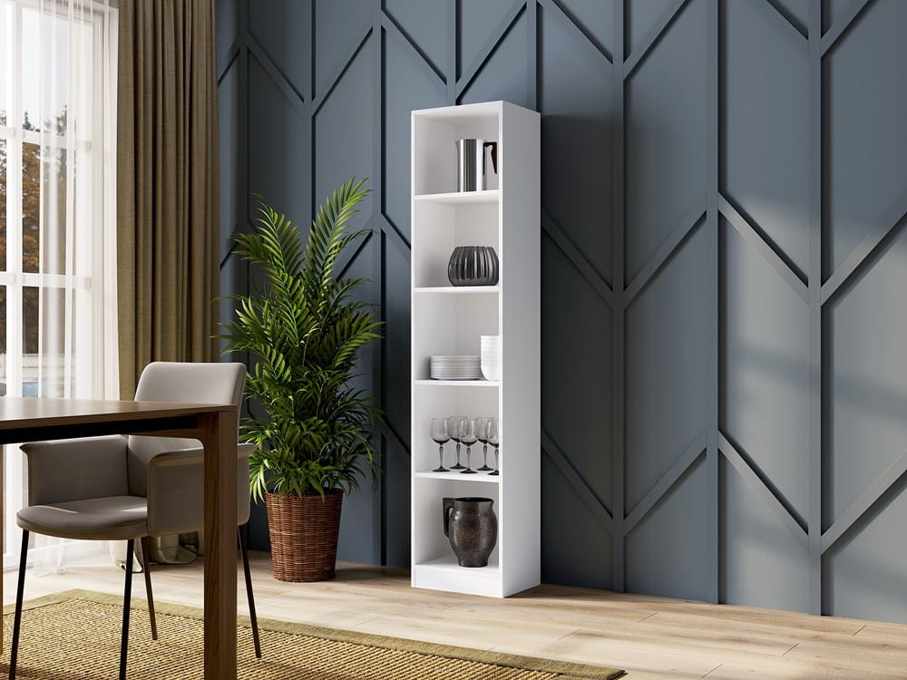 Niebanalny regał biały FOX 40cm na książki czy ozdoby sprawdzi się w każdym mieszkaniu. Jest to mebel o dekoracyjnym charakterze, który będzie stanowił praktyczną ozdobę każdego wnętrza. Należy podkreślić, że został wyprodukowany z bardzo dobrych gatunkowo materiałów które wyróżniają się wysoką trwałością oraz odpornością na usterki. Regał na książki wąski biały FOX 40cm jest przystosowany do wysokich obciążeń, co przekłada się na bezpieczeństwo użytkowania.