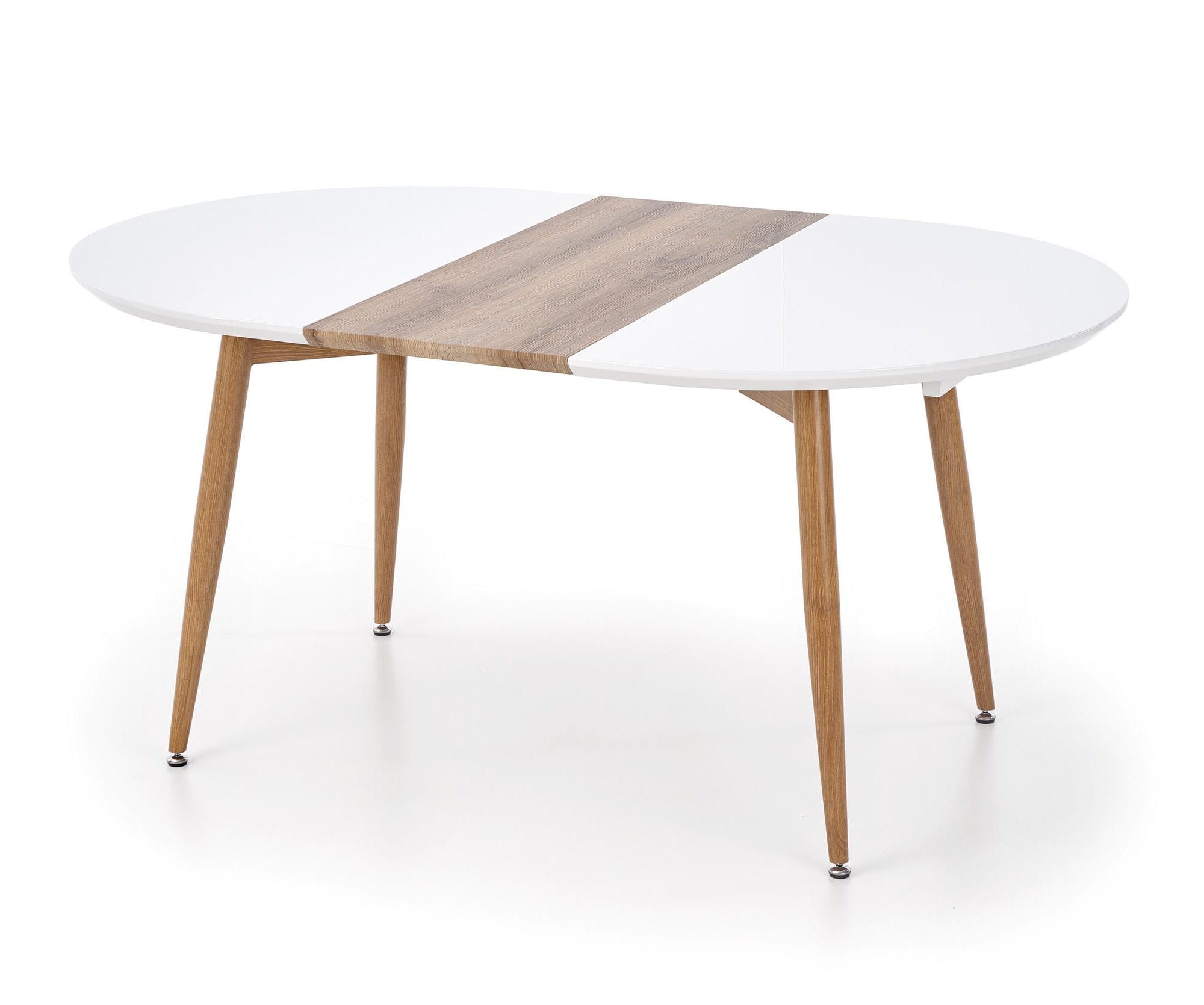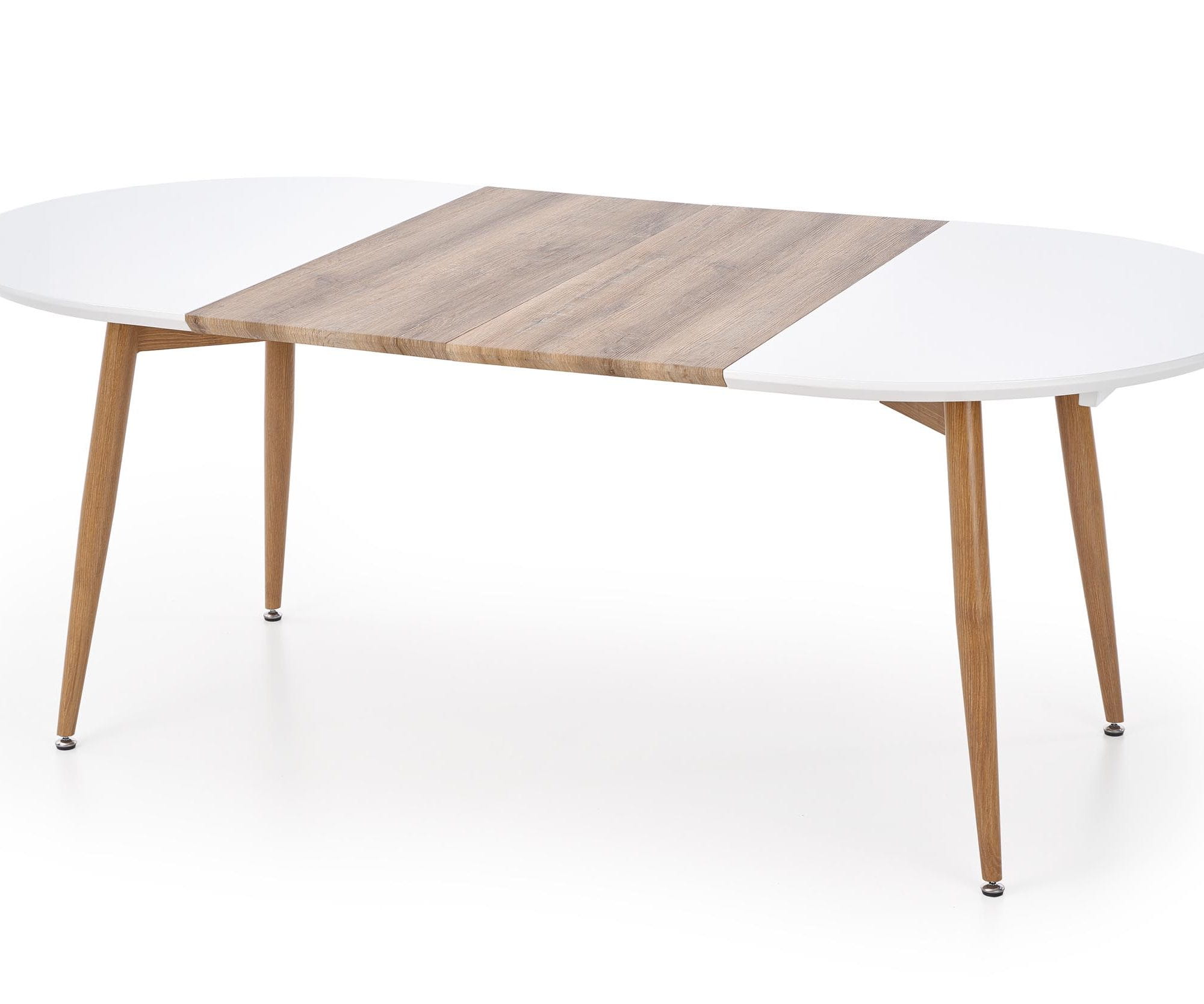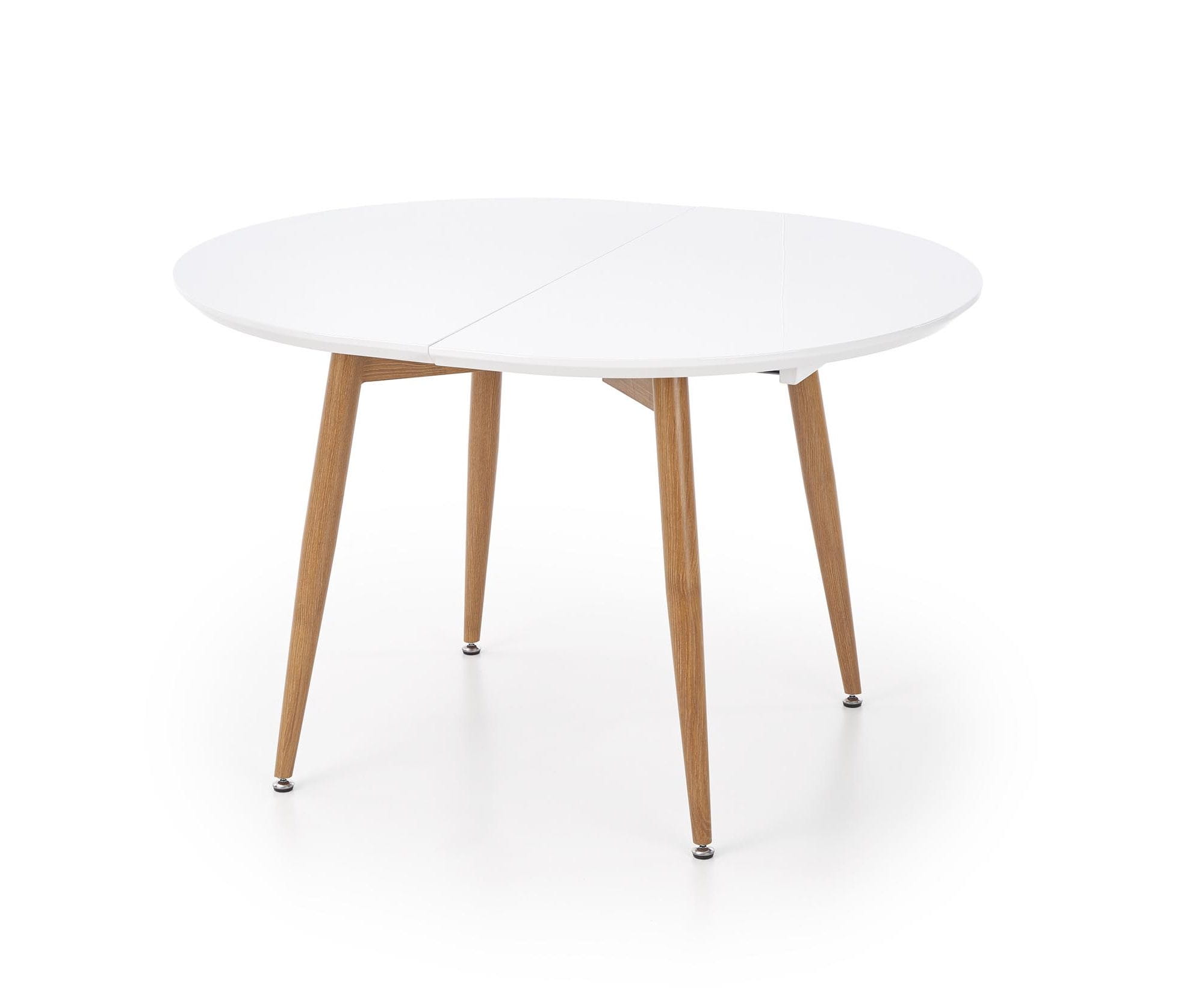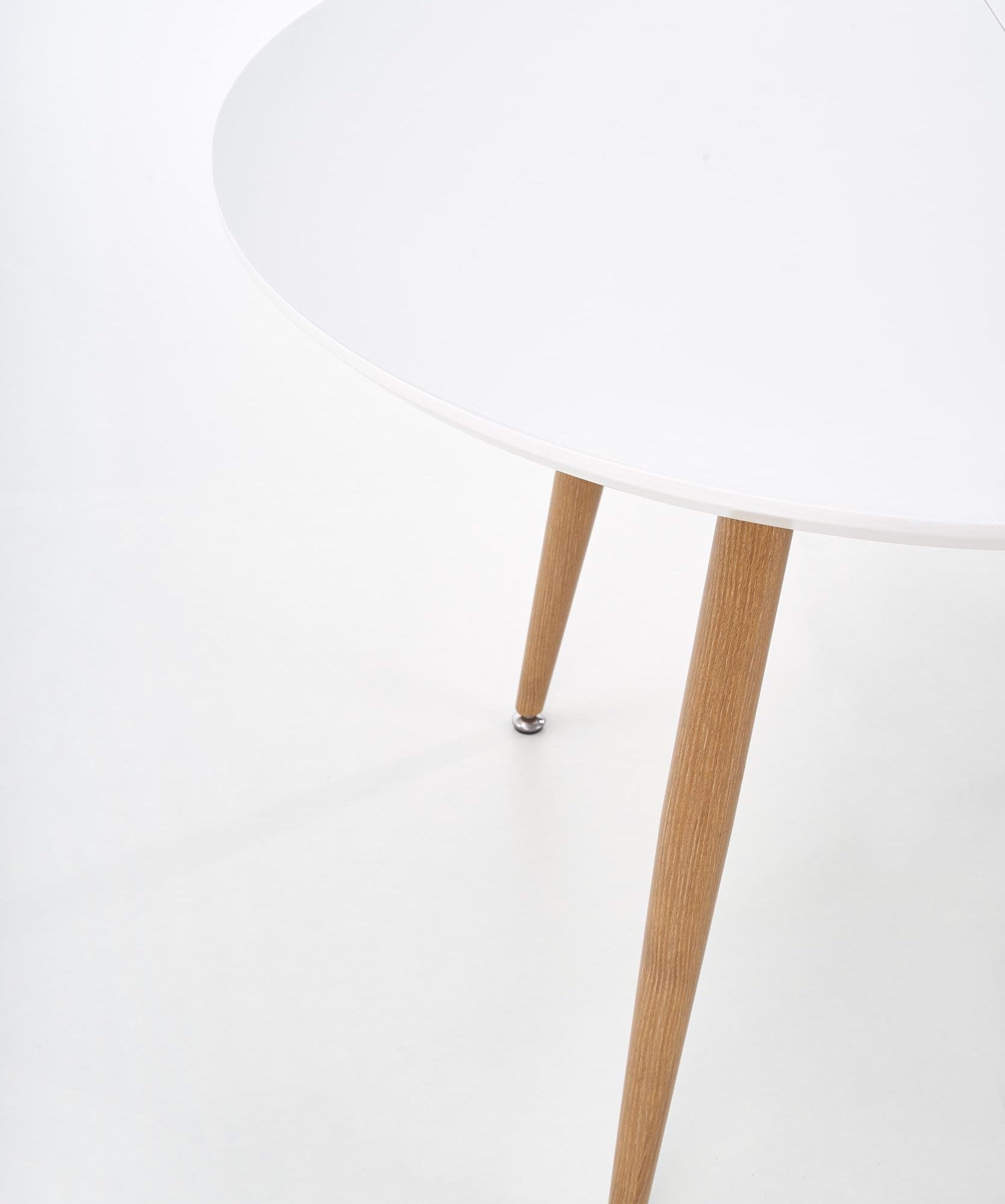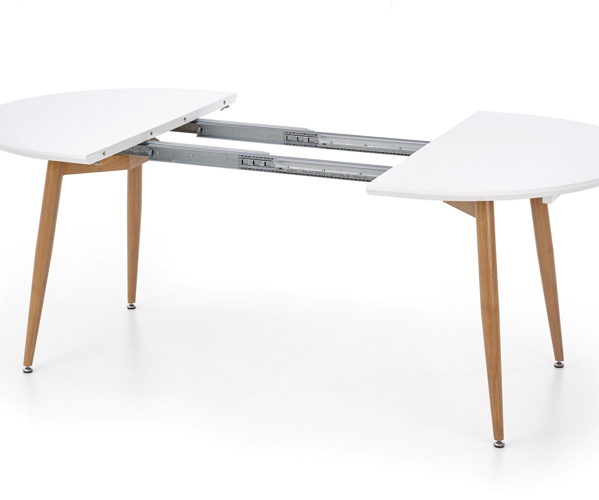 Połączenie lakierowanego i laminowanego MDF z solidnymi, stalowymi nogami zapewnia trwałość oraz estetyczny wygląd przez długi czas. Wykończenie w kolorze dębu miodowego ociepla formę i dobrze współgra z naturalnymi tkaninami, ceramiką oraz dodatkami w odcieniach beżu i jasnego drewna. Stół okrągły rozkładany biały pozostaje elegancki i aktualny niezależnie od zmieniających się trendów.