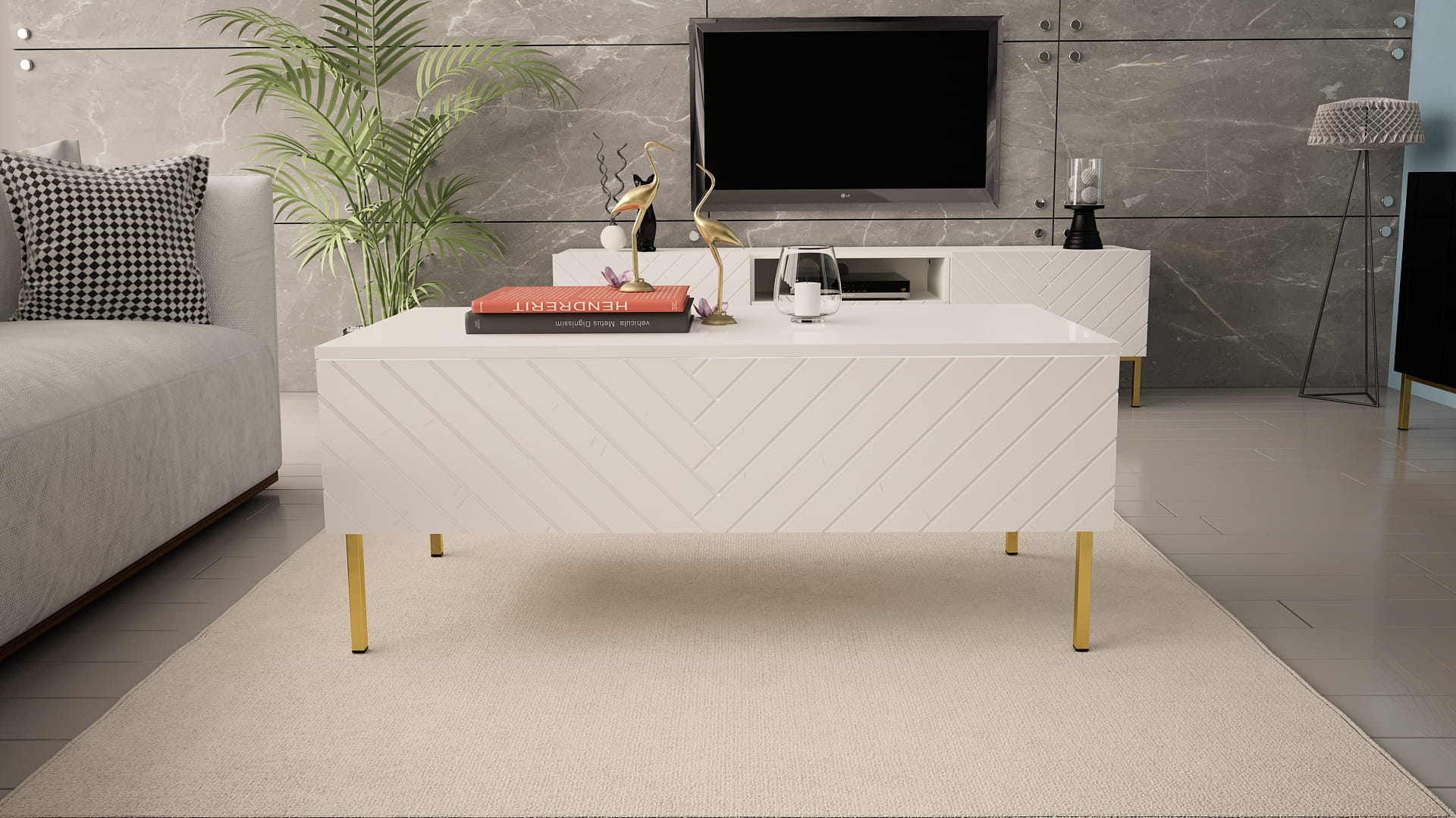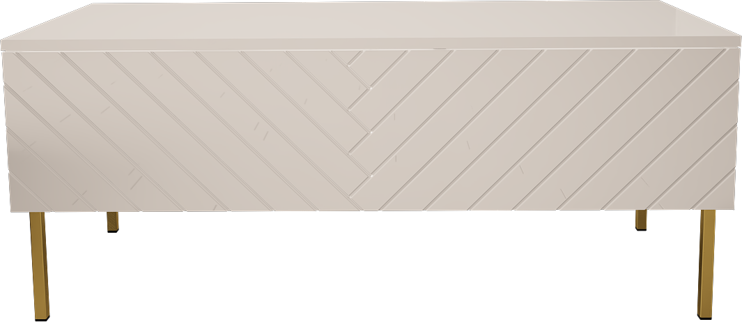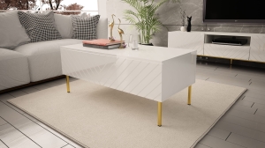 Stolik biały połysk GALA posiada stylowy design idealny do wnętrza nowoczesnego, loftowego a także skandynawskiego. Nie musisz ograniczać się do stawiania go w salonie, znakomicie uzupełni wystrój sypialni lub pokoju młodzieżowego. Wyróżnia go wysoka funkcjonalność, nadzwyczajna wygoda użytkowania i poręczność, dzięki czemu korzystanie z niego to czysta przyjemność. Stoliki kawowe biały połysk GALA z jodełką na frontach oraz złotem to idealne połączenie.
