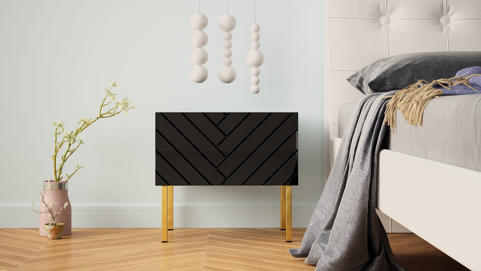 Oryginalna szafka nocna czarna GALA 50cm to niezbędny element w nowoczesnej sypialni. Niezwykła funkcjonalność oraz błyszczący blat z jedną pojemną szufladą to czysta wygoda użytkowania. Możesz mieć pewność, że ten oryginalny model pasujący do każdego wnętrza przykuwa wzrok i stanowi ciekawe wykończenie. Szafka nocna czarna połysk GALA jest stworzona z wykorzystaniem najnowszych trendów, a geometryczny wzór w połączeniu ze złotem to piękno w prostej formie.
