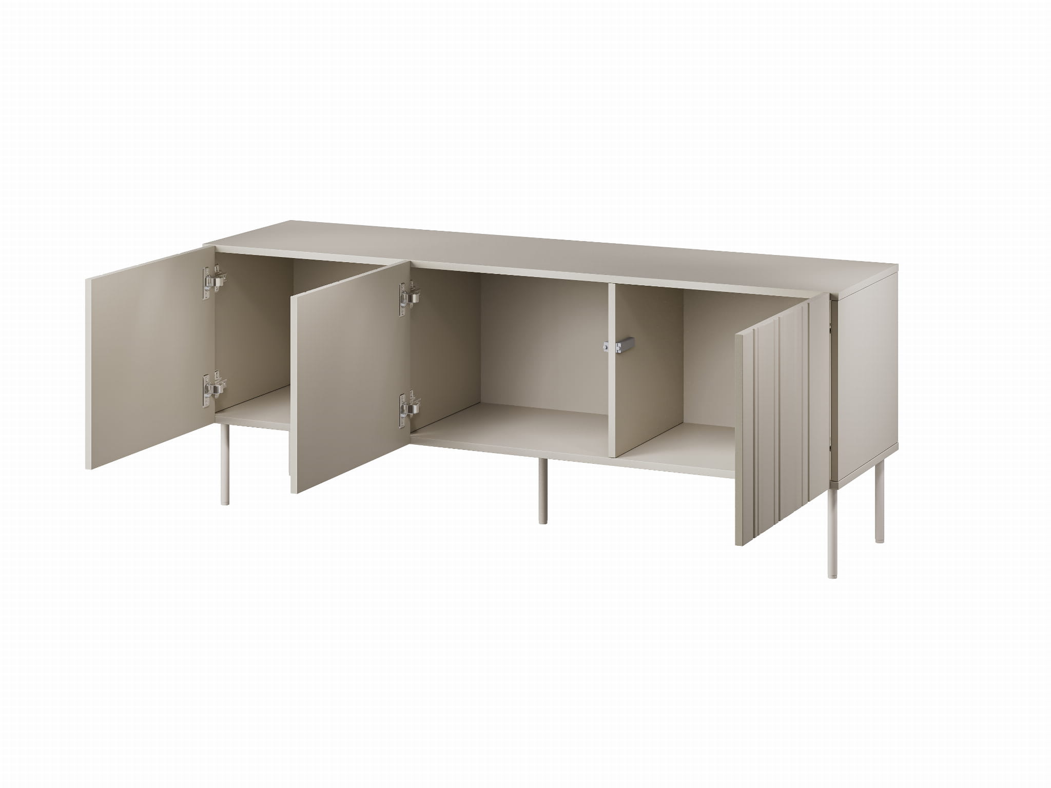 Korpus wykonano z płyty laminowanej 16 mm w beżowym macie, co daje jednolitą, łatwą w utrzymaniu powierzchnię. Fronty z MDF 16 mm z ryflowaniem w tym samym odcieniu tworzą elegancką, wyczuwalną w dotyku fakturę, a metalowe nóżki w kolorze mebla subtelnie dopełniają całość. W tej wersji szafka RTV 150 cm sprawdzi się w mniejszych i średnich salonach.