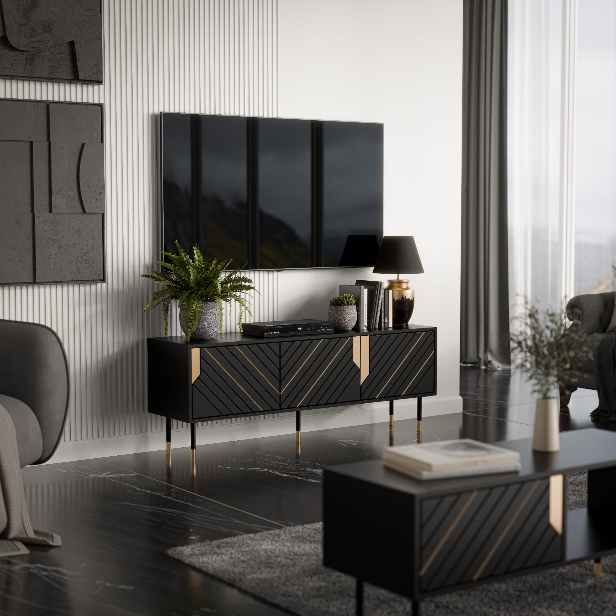 Ten model MOUNTAIN 3D przyciąga wzrok kontrastem matowej czerni i złotych akcentów, które pięknie odbijają światło. W nowoczesnych aranżacjach czarna szafka RTV tworzy eleganckie tło dla telewizora i dekoracji, dobrze łącząc się z jasnymi ścianami, marmurem oraz ciepłymi tkaninami. Rytm frezów na frontach nadaje całości dynamiczny, dopracowany charakter.