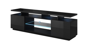 Szafka RTV Czarna EVA 180 cm to elegancki mebel z oświetleniem LED, połyskowymi frontami i przestronnym wnętrzem, idealny do nowoczesnych aranżacji. To propozycja dla osób szukających funkcjonalnej i stylowej czarnej szafki RTV.